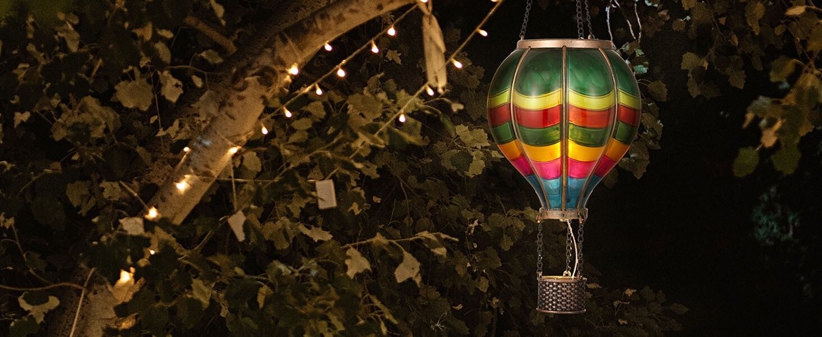 Add bright color and a whimsical design to your yard with this hand-painted hot air balloon mobile. Hang it from a hook on your porch or a branch on a tree to enjoy during the day. At night it automatically shines with light.
