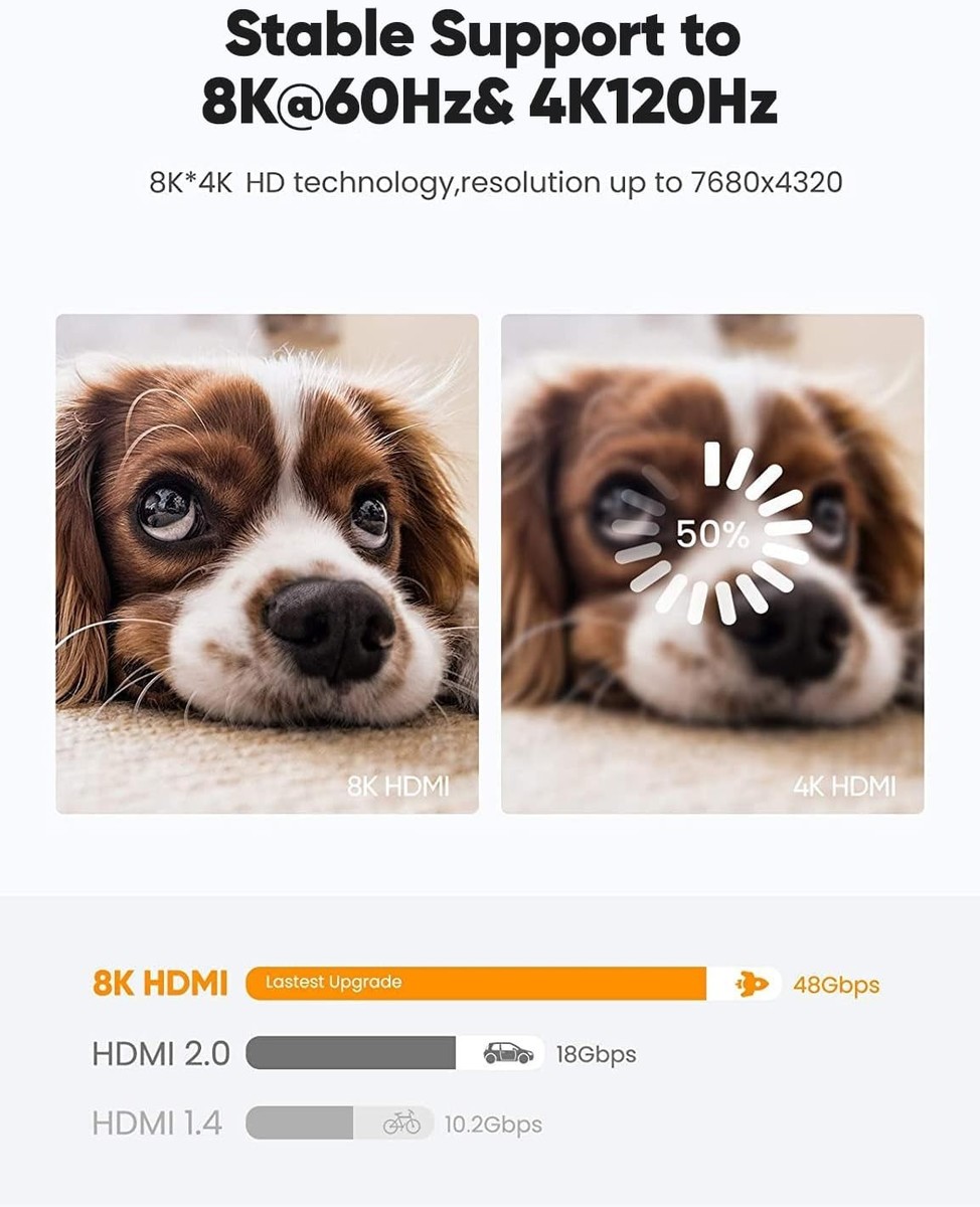 HDMI 2.1: Highwings 8K HDMI Cable conforms to the standard HDMI 2.1 version. Its transmission speed is from 18Gbps to 48Gbps (6GB/s) directly compared with HDMI. Support eARC and also backward compatible with HDMI 2.0b/2.0a/1.4/1.3/1.2/1.1