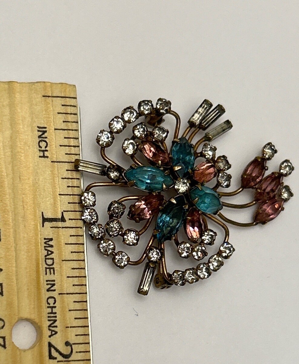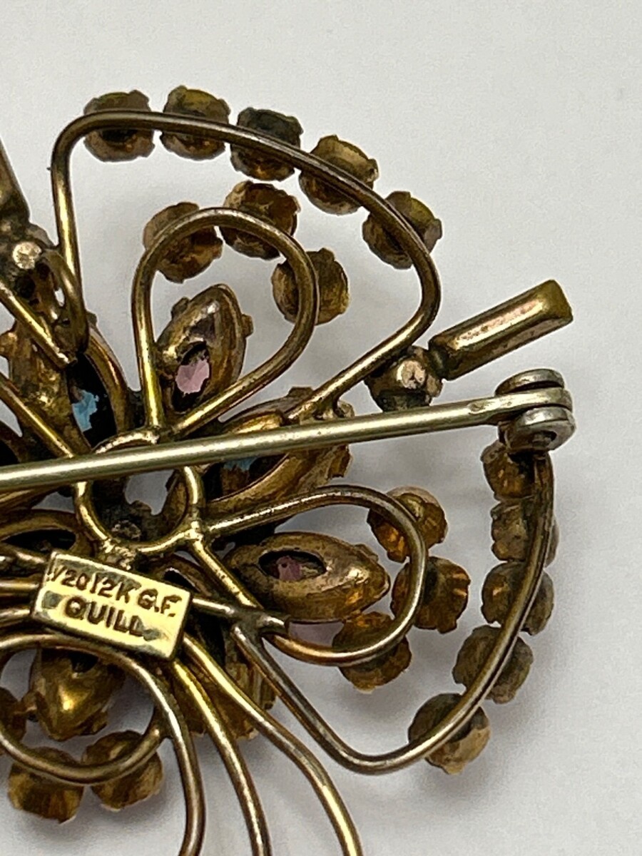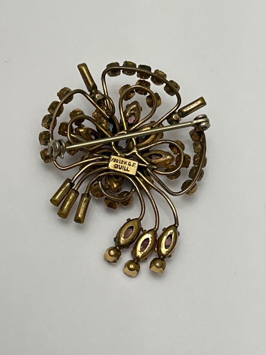 Quill 12K GF Gold-Filled Pink & Blue Floral Rhinestone Brooch Pin Vintage 1950s