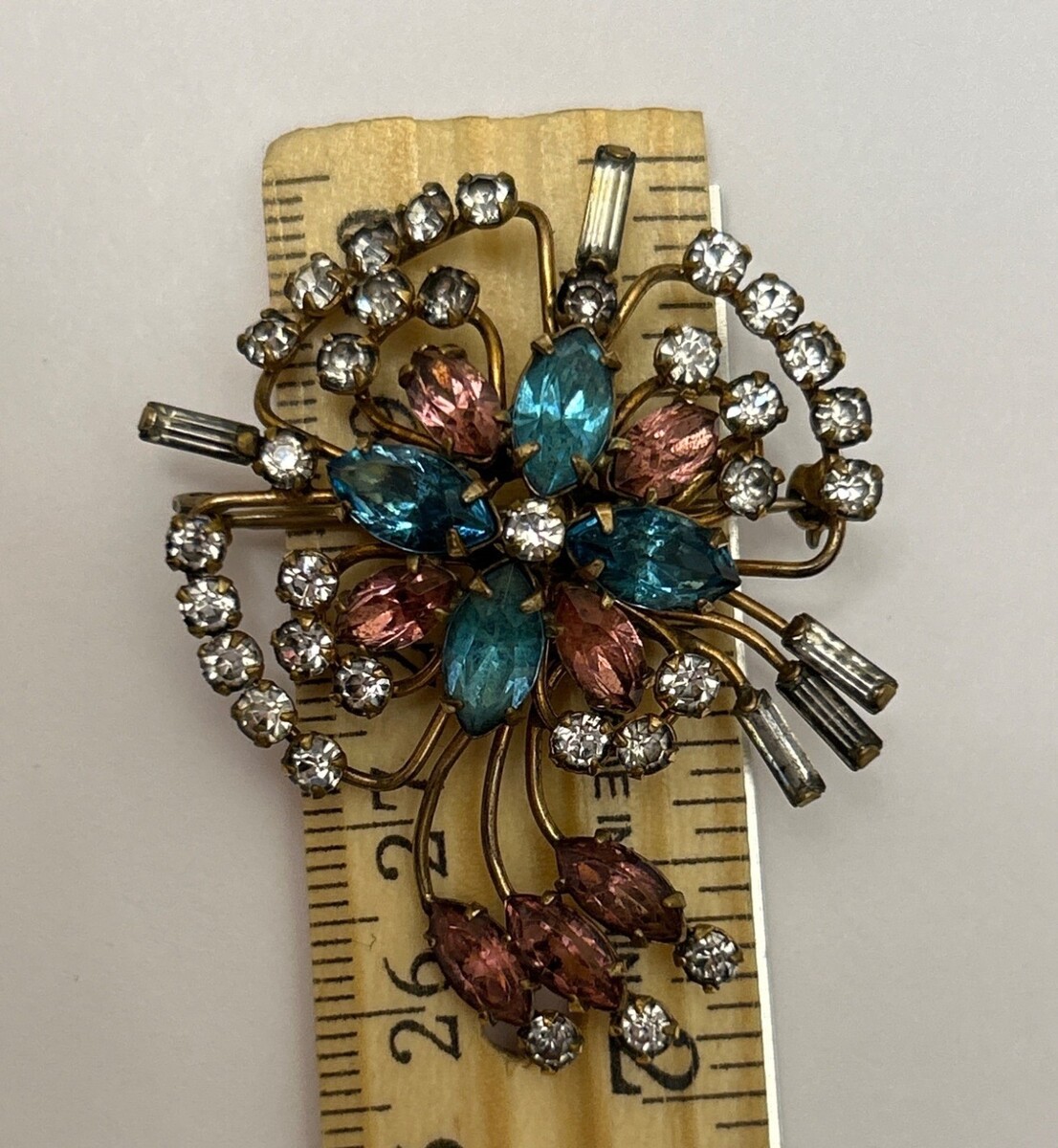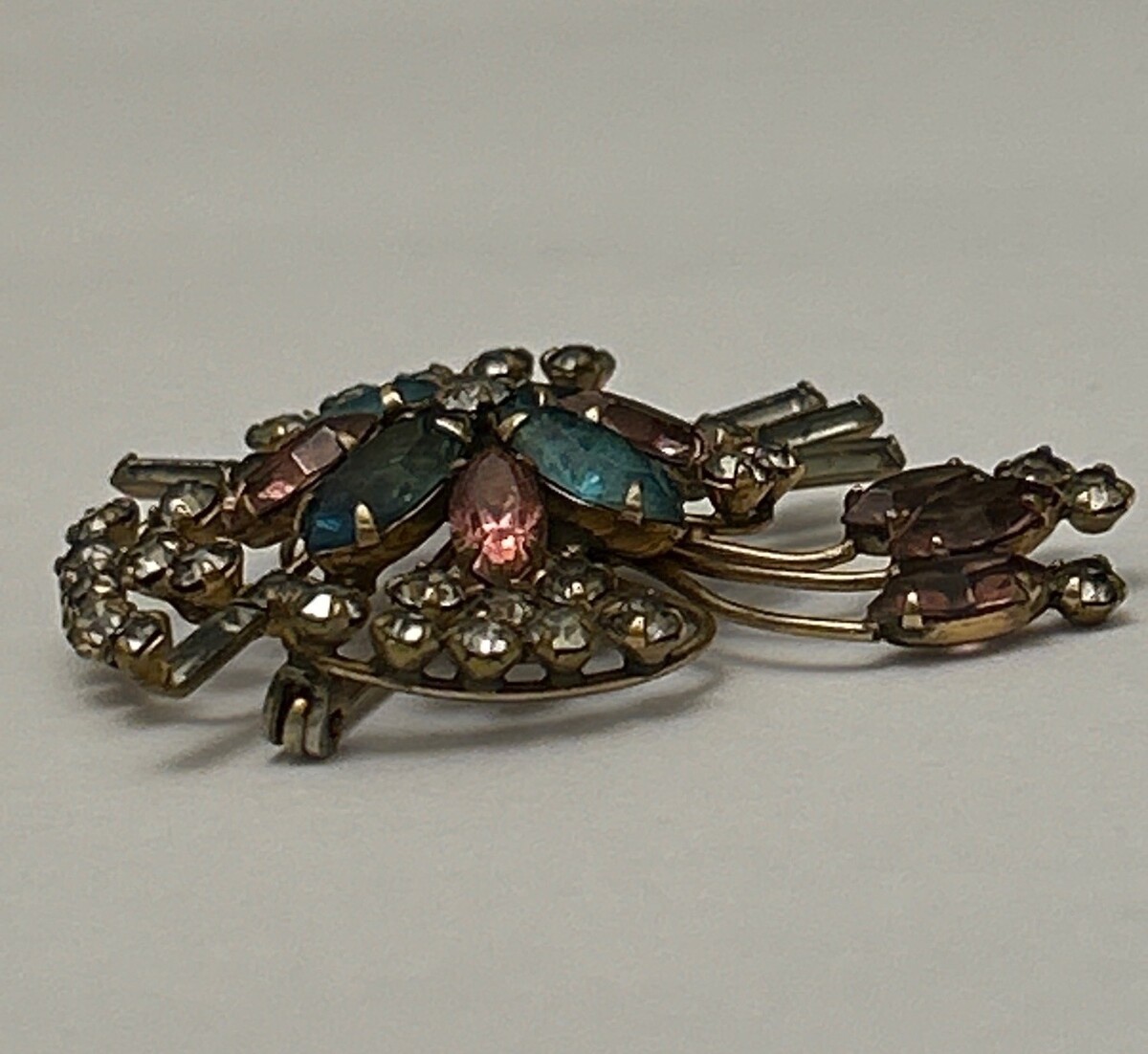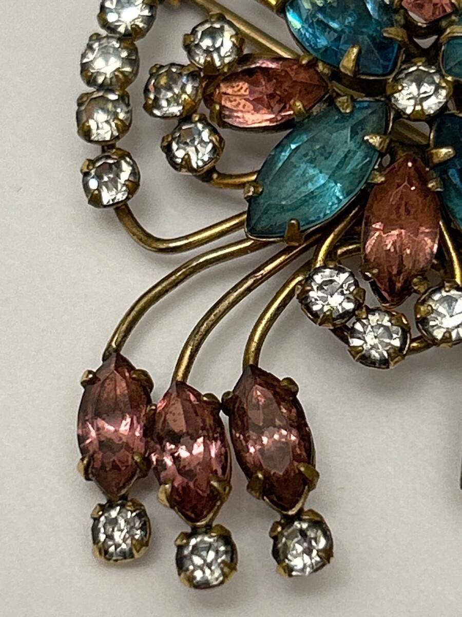 Quill 12K GF Gold-Filled Pink & Blue Floral Rhinestone Brooch Pin Vintage 1950s