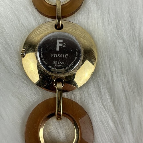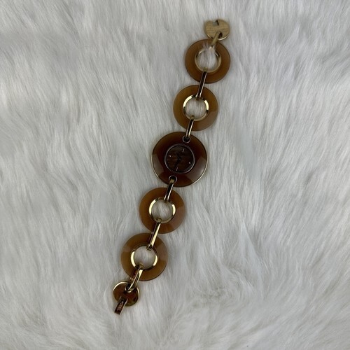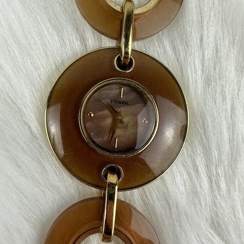 Fossil Watch Women Gold Tone Brown Circles Link Band Needs Battery 7"