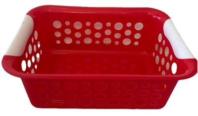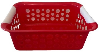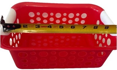 The product is a RED plastic storage bin with reinforced handles, measuring 11 inches in length, 8 inches in width, and 4 inches in depth. It is designed with a solid rectangular shape and a glossy finish. The storage basket is free-standing and comes in a single unit with no assembly required. It is of original style and is ideal for organizing household items with easy access and transport. The product is brand-named Greenbrier and is manufactured in China.