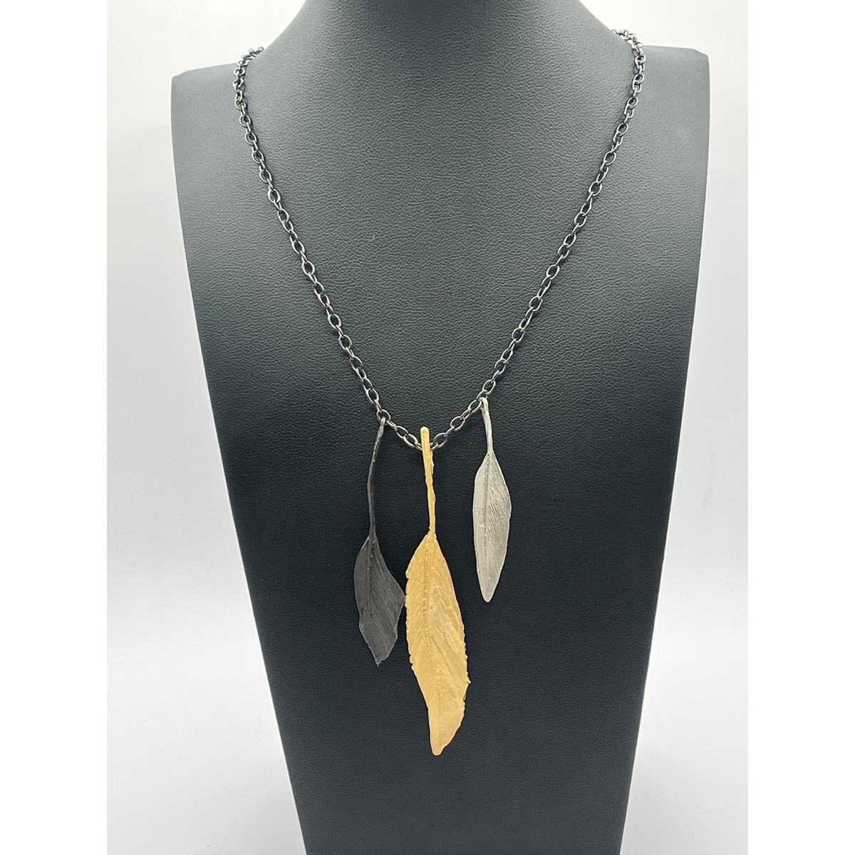 Cast bronze with 24k gold, silver, and gunmetal finishes. 20 inches with 2-inch extension. A gorgeous piece by famous botanical jewelry designer Michael Michaud. It captures the beauty and exquisite detail of nature using soft patinas on bronze. glass. His attention to intricate detail results in true to nature, botanical jewelry. This unique jewelry is made by creating molds directly from botanical elements in a process similar to lost-wax casting. Michael Michaud uses an actual leaf, branch, or flower in place of the wax model. A mold is created around the botanical element and, as it is heated, the plant matter burns away and leaves behind a beautifully detailed mold of itself. Michael Michaud Jewelry is renowned for its beauty and workmanship and is featured in the finest museums around the world. Many collections are commissioned by leading museums such as The Victoria Albert Museum, The Art Institute of Chicago, The National Gallery of Art, and the Chateau de Versailles.