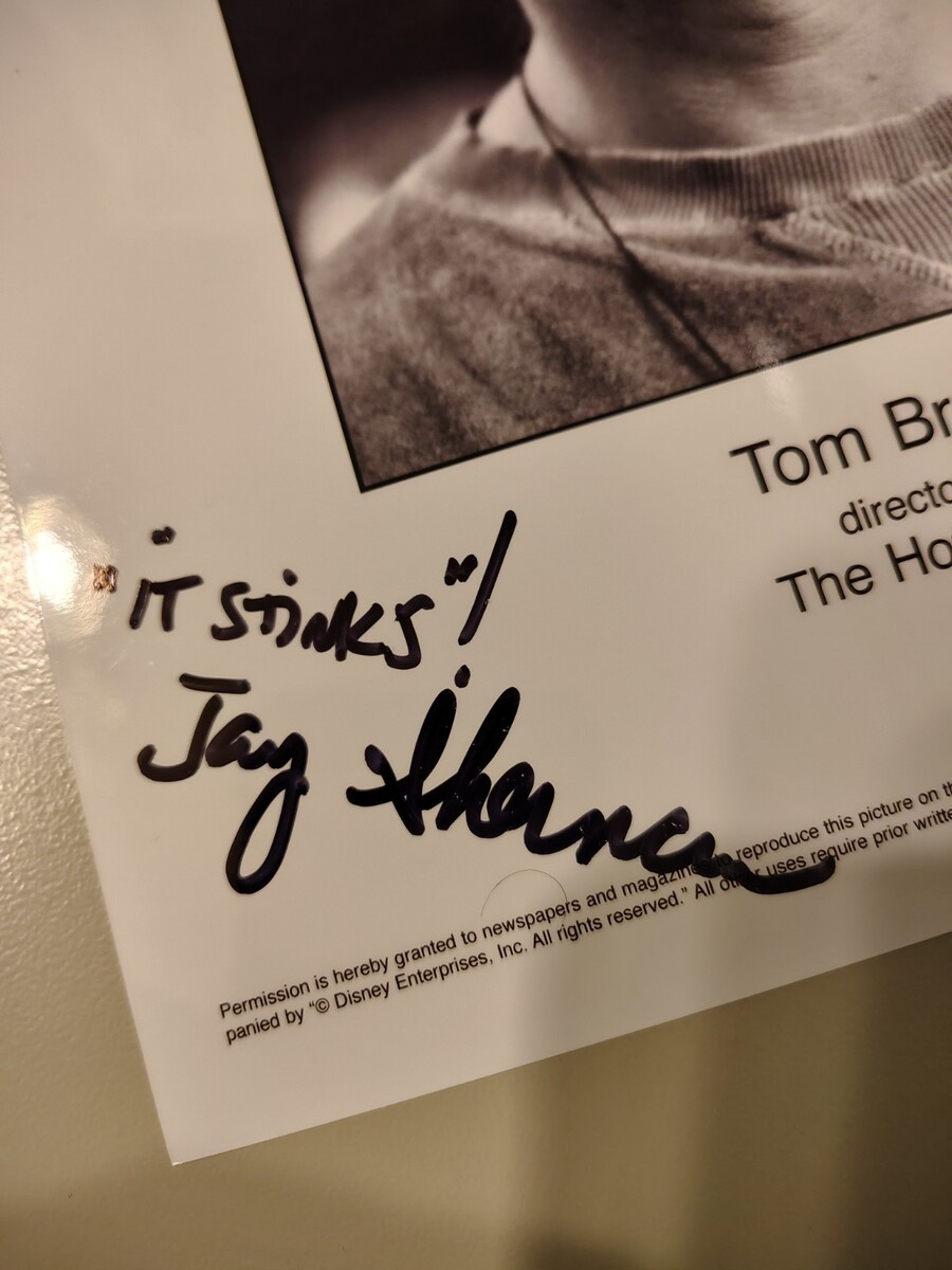 On the right, director Tom Brady has provided an authentic signature with the hilarious inscription: "Jeff, You NEED a 'Hot Chick'!". On the left, it is signed "It Stinks!" / Jay Sherman. This is a fantastic crossover piece, as Brady was a writer for the cult hit The Critic, starring the voice of Jon Lovitz.