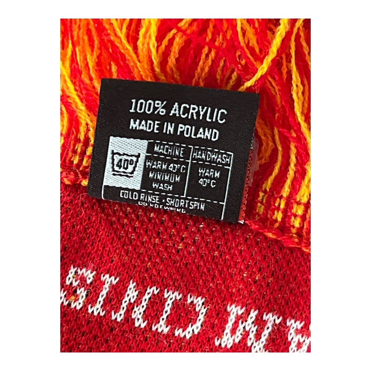 Vintage-style red and gold knit scarf inspired by Gryffindor house, featuring a woven winged lion crest and Latin motto text at each end. Designed with classic horizontal striping and finished with tasseled fringe, this scarf reflects early Harry Potter?era fan merchandise and makes a strong display or wearable collectible for fantasy and wizard-themed collections. Includes original hang tag and care label.
