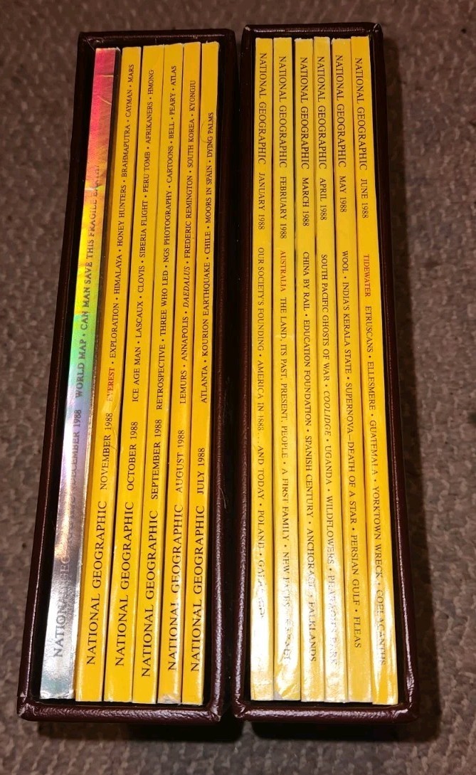 Good used condition National Geographic complete year in slip cases. 1988. Some wear from age and storage.