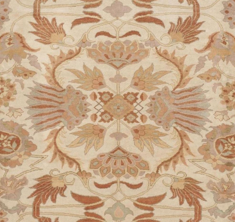 This extraordinary hand-knotted Egyptian Sultanabad-style rug measures a commanding 14'5" x 19'0", perfectly suited for large-scale living rooms, formal dining areas, or expansive great rooms, where its majestic open-field layout unfolds with intricate symmetrical floral bouquets, graceful vine arabesques, and a prominent central medallion in rich terracotta and rust tones contrasted against a warm ivory-beige ground with accents of soft sage, muted gold, and earthy browns. Woven from 100% premium wool, the rug presents a dense, luxurious pile with exceptional depth, natural wool luster, and remarkable resilience that promises to age gracefully into an even softer, more characterful heirloom under normal use and care. Multi-layered borders featuring repeating palmettes, blossoms, and meandering vines encircle the elaborate field, resulting in a breathtaking, museum-quality piece that radiates timeless grandeur, refined warmth, and sophisticated vintage-inspired beauty for elevated interiors.
