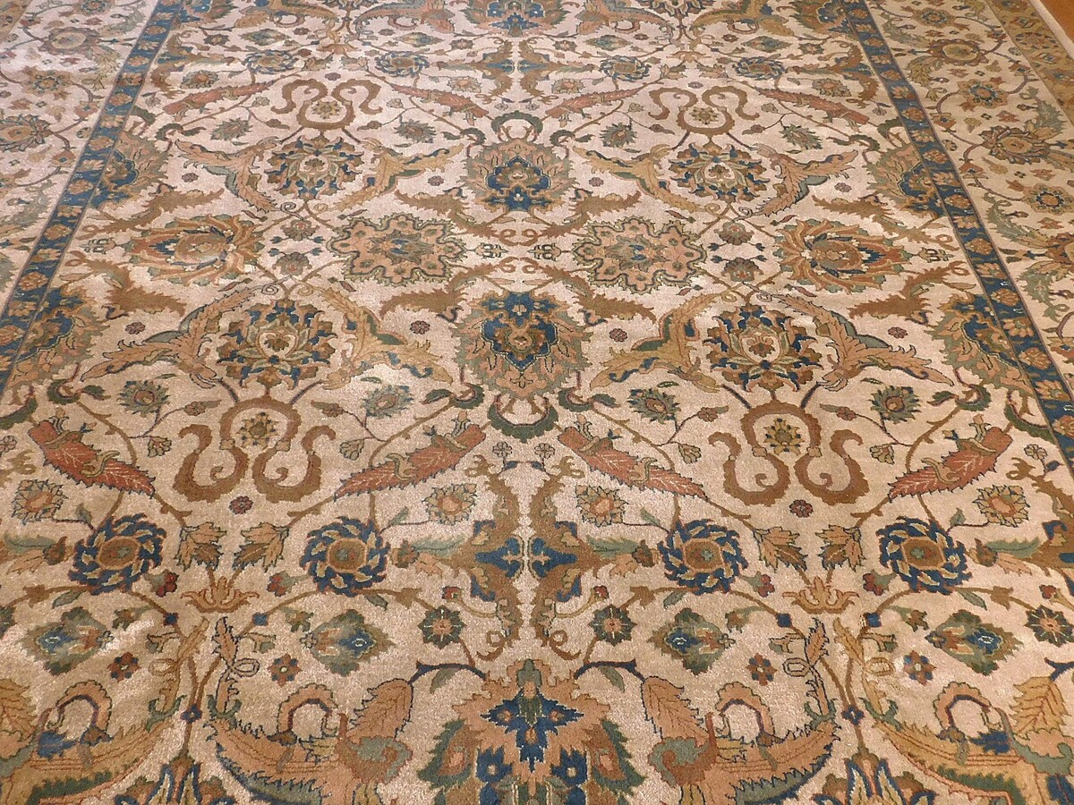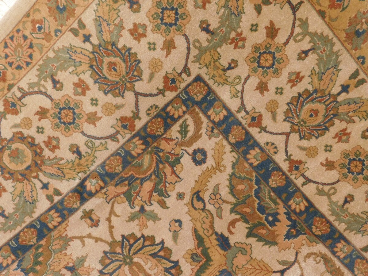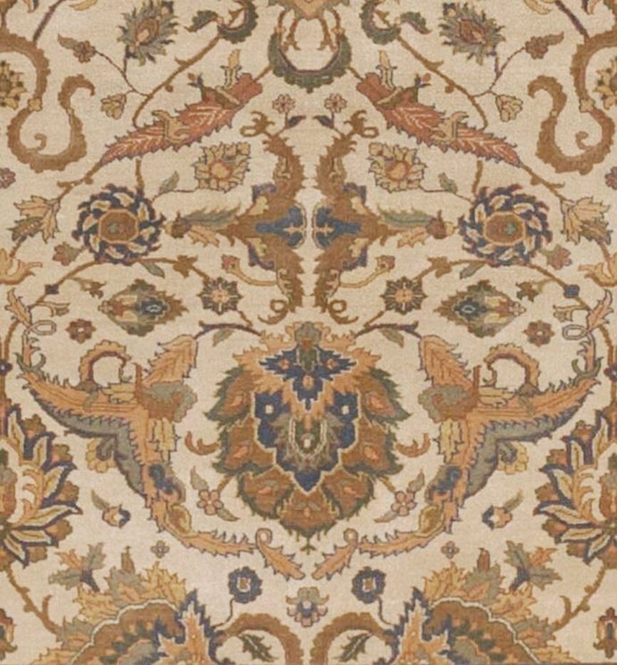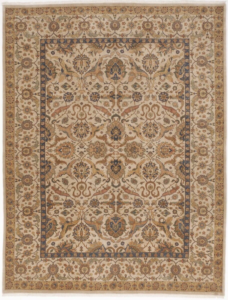 This stunning hand-knotted Sultanabad-style rug measures 9'2" x 12', featuring a beautiful open-field design with graceful all-over floral motifs, a subtle central medallion, and intricate vine scrolls in a sophisticated palette of soft ivory field accented by muted blues, warm terracottas, golds, and earthy browns. Crafted from 100% premium wool, it boasts a luxurious plush pile, natural luster, and exceptional durability that improves with age and proper care. The detailed border frames the composition perfectly with repeating floral elements and corner spandrels, making this grand room-size piece an elegant, timeless addition to any living space or formal area.