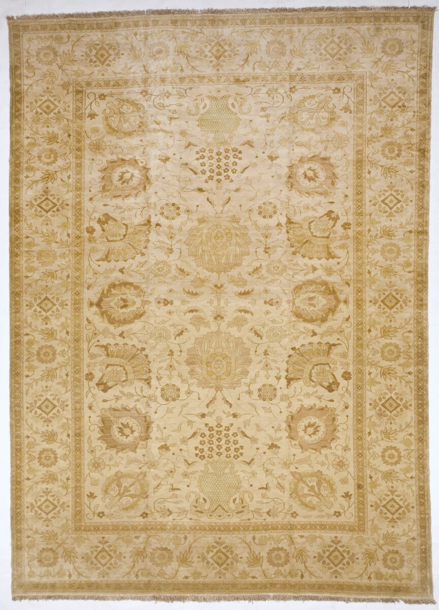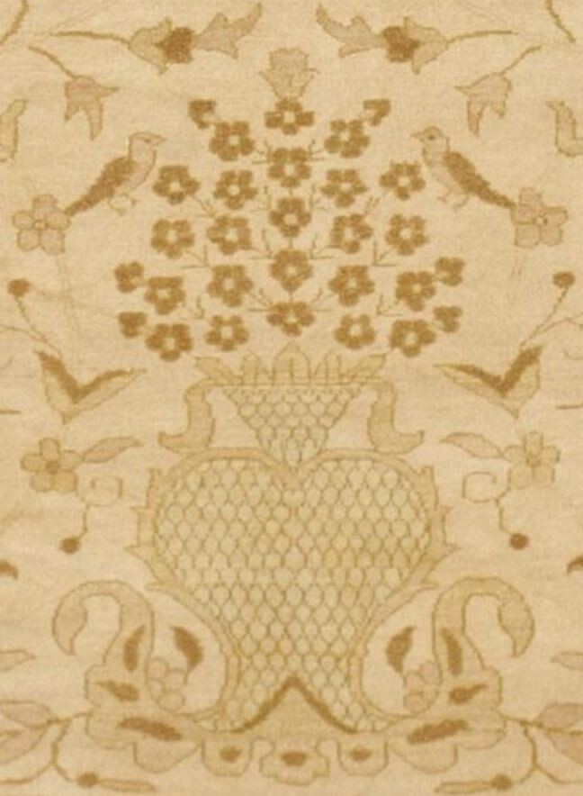 This grand hand-knotted Egyptian Sultanabad-style rug measures 12'0" x 17'1", an expansive size perfect for large living rooms, formal dining areas, or great rooms, where its elegant open-field design can fully unfold with intricate all-over floral bouquets, graceful scrolling vines, and a prominent central urn medallion filled with blossoms and foliage in soft golden-beige tones accented by warm camel, subtle ivory, and delicate earthy highlights. Crafted from 100% premium wool, it offers a thick, plush pile with a refined natural luster and outstanding durability that will develop a luxurious softness and rich patina over time with proper care. The multi-layered borders feature repeating diamond motifs, palmettes, and meandering floral elements that beautifully frame the detailed central composition, creating a harmonious, timeless masterpiece that brings understated sophistication, warm luminosity, and enduring elegance to spacious, refined interiors.