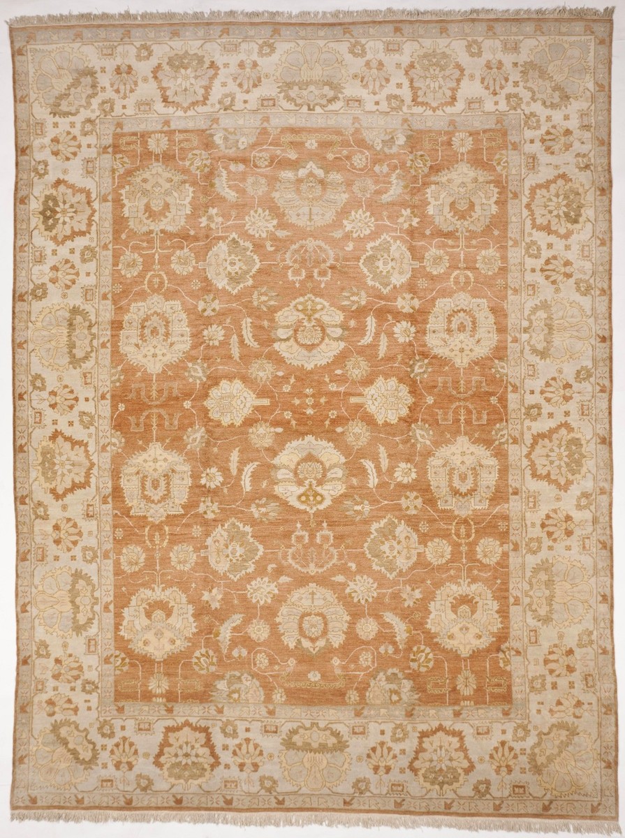 This magnificent hand-knotted Egyptian Sultanabad-style rug measures an impressive 12' x 16', offering grand scale for spacious living rooms, dining rooms, or formal gathering areas with its expansive open-field composition featuring intricate all-over floral bouquets, elegant vine scrolls, and large central medallions in a warm, sun-faded terracotta orange ground accented by soft ivory, beige, and subtle earthy tones. Crafted from 100% premium wool, it delivers a thick, plush pile that develops a rich patina and softness over time with regular, gentle care. The floral and geometric border beautifully frames the intricate field, creating a luxurious, timeless centerpiece that infuses any large interior with an understated elegance, warmth, and sophisticated vintage charm.