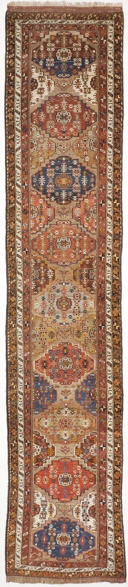 This Antique Hand Knotted Kurdish Runner Rug is a unique and decorative piece for any room or hallway. Made from 100% wool with a pile height of medium thickness (10mm), this rug features a Multi-Medalian pattern in a traditional tan color. Hand-knotted with intricate detail, this rug exudes an antique style and cultural influence from Kurdistan. Measuring 3'4'' x 15'10'', it is a one-of-a-kind piece that adds character and history to any space. Professional cleaning recommended to preserve its quality and authenticity.