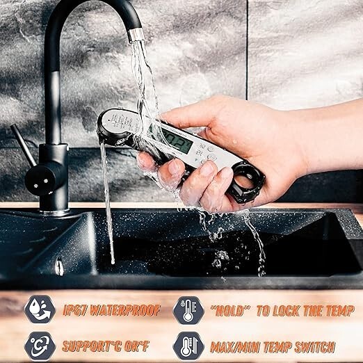 IP67 Waterproof with Durability: With IP67 certification, the grill thermometer is super easy to clean. (NOTE: Please wipe it with a soapy cloth or rinse it to clean, and DO NOT soak it or put in a dishwasher.) The probe is made of 304 stainless steel, non-toxic and safe for contacting food. Coated with premium ABS material, the thermometer lasts long and works with great durability