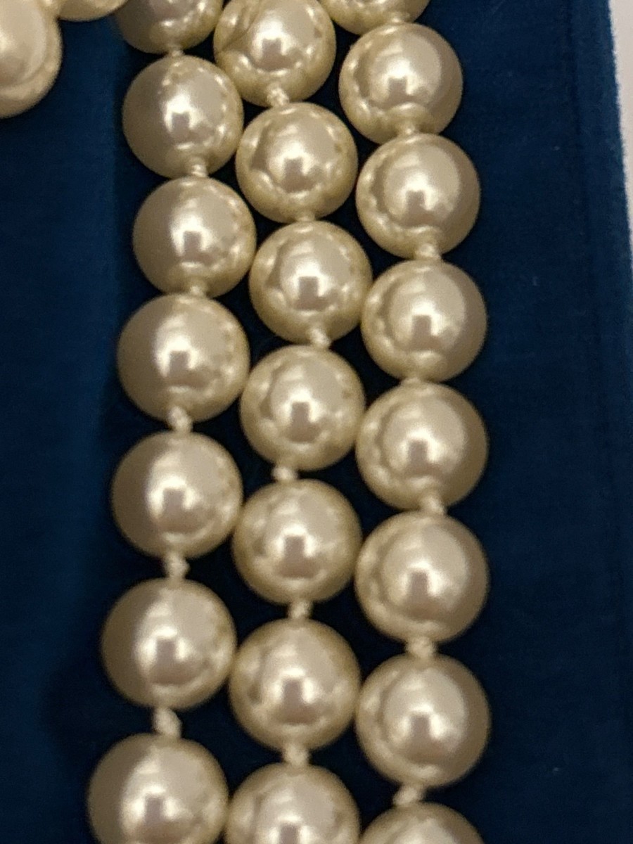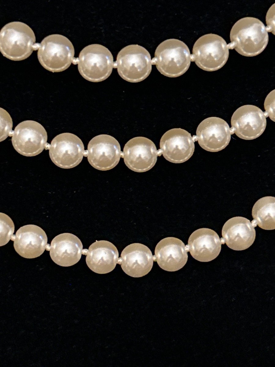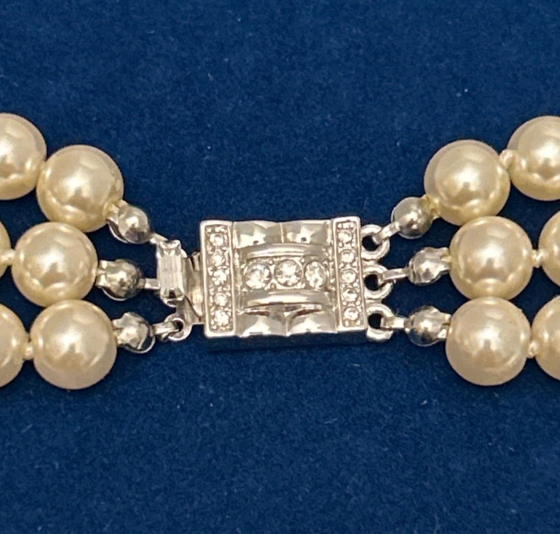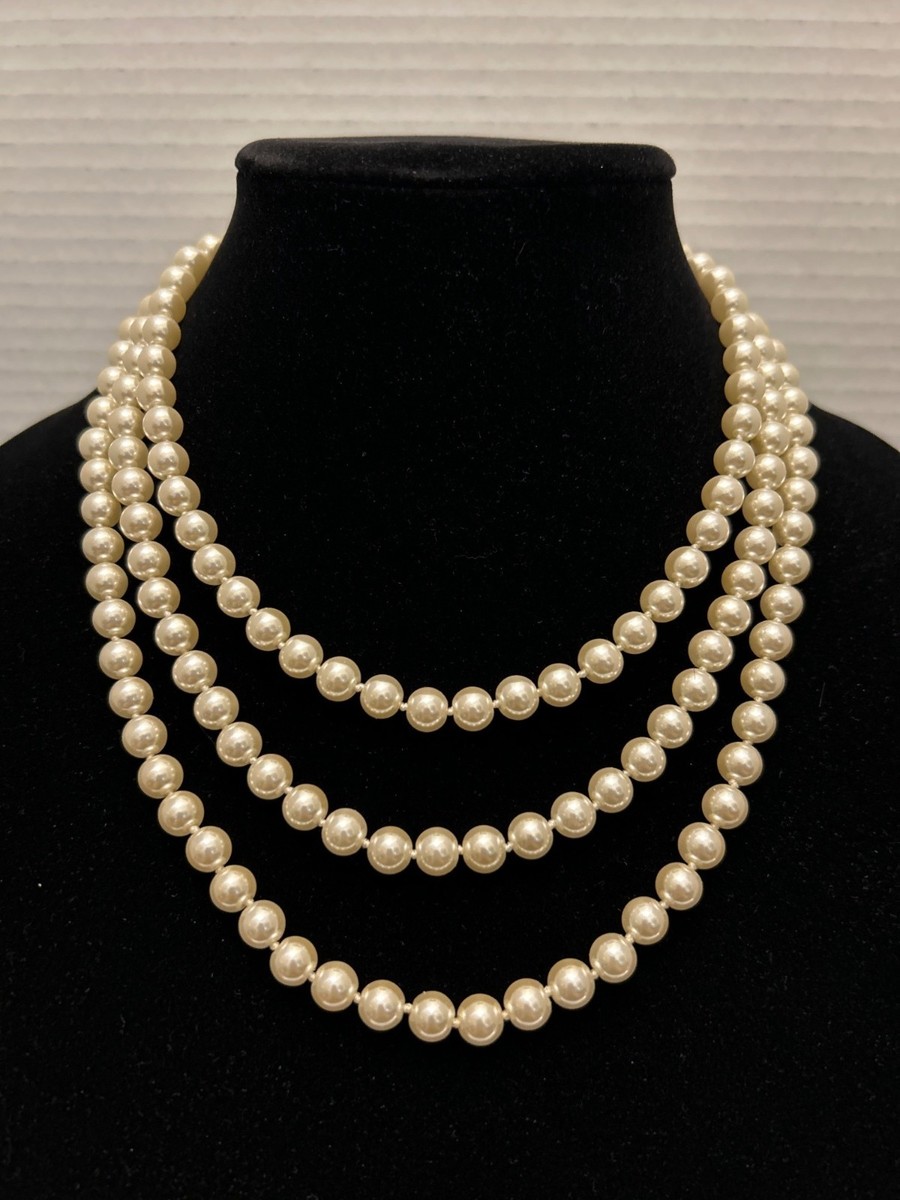 ? Triple-strand faux pearls in nicely layered rows that lay nicely when worn.
