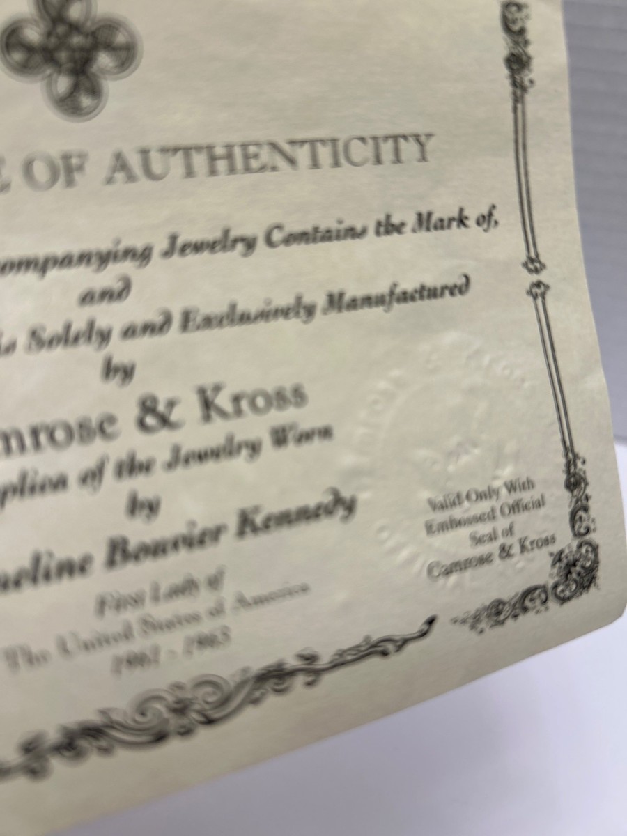? Includes original box in royal blue velevet, certificate of authenticity (COA) and "love note" from Mrs. Kennedy.