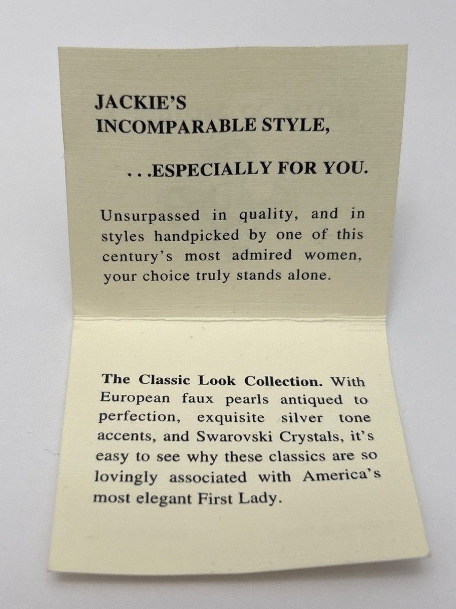 This a piece from vintage jewelry designers Camrose Kross that reproduces a classic, iconic accessory from the beloved Jacqueline Kennedy (Onassis). This classic triple-strand faux pearl necklace was created in partnership with Mrs. Kennedy. This set is believed to be from the original few years (1998-2001) during which this piece was first produced and during which the quality was most elevated. This necklace showcases timeless elegance and is very versatile. We agree with Mrs. Kennedy's quote: "Pearls are always appropriate." This triple strand would be lovely paired with your business, semi-formal, formal or romantic date attire. This lovely set could even be paired with the Bride's wedding gown, reception outfit or even for the Mother of the Bride.