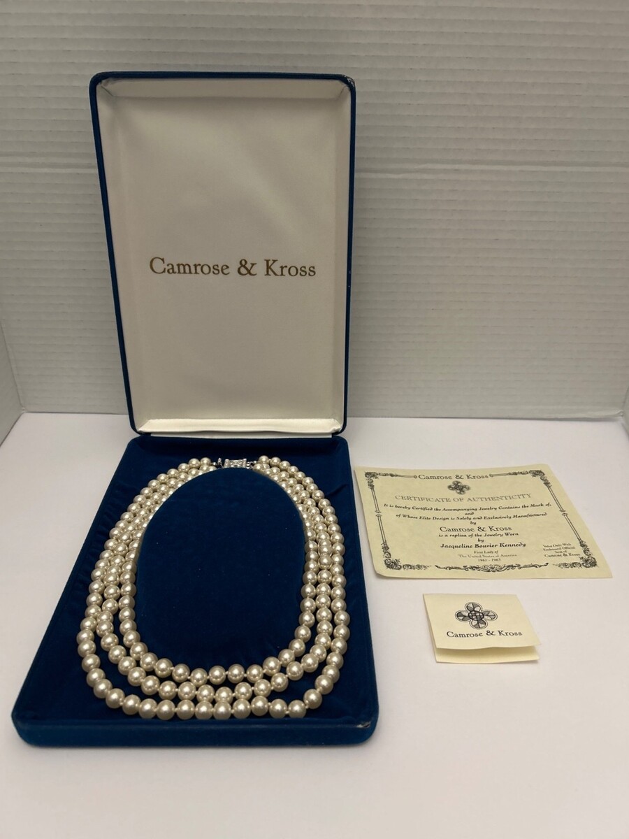 Camrose & Kross Jacqueline Kennedy Triple-Strand Faux Pearl Necklace Box & COA