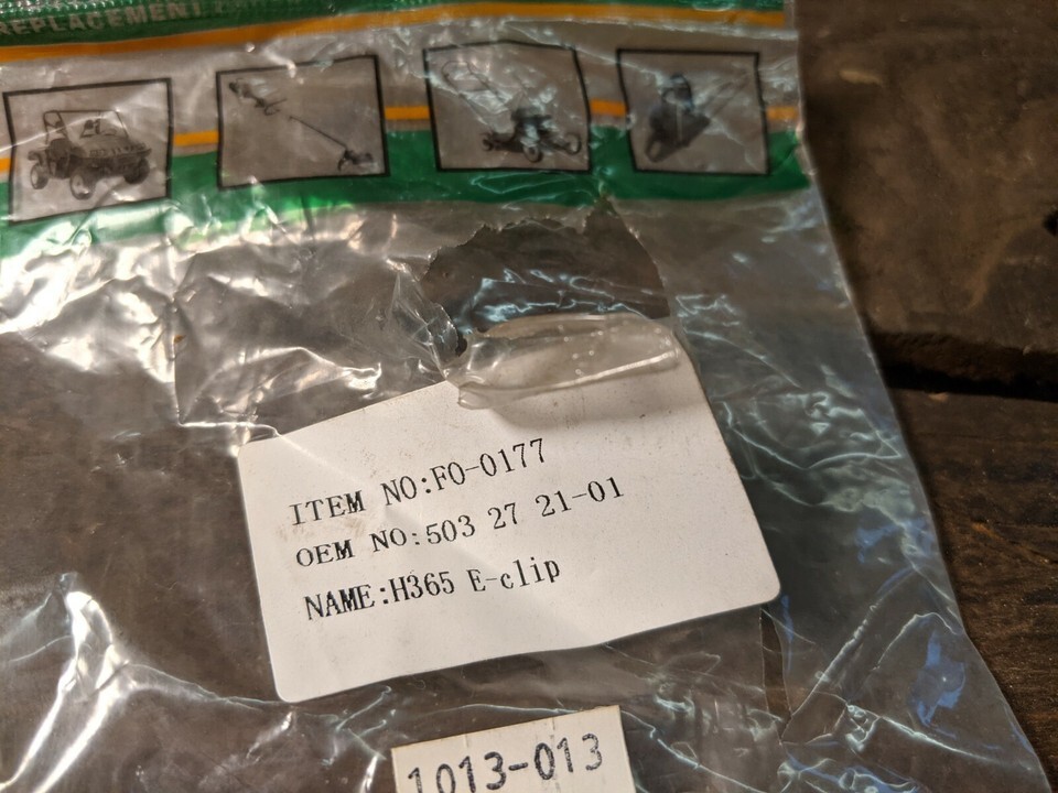 This is a Forester FO-0177 E-Clip Replaces Husqvarna 503272101. The package is a little damaged but the product is in great shape. Please evaluate the pictures carefully before you buy.