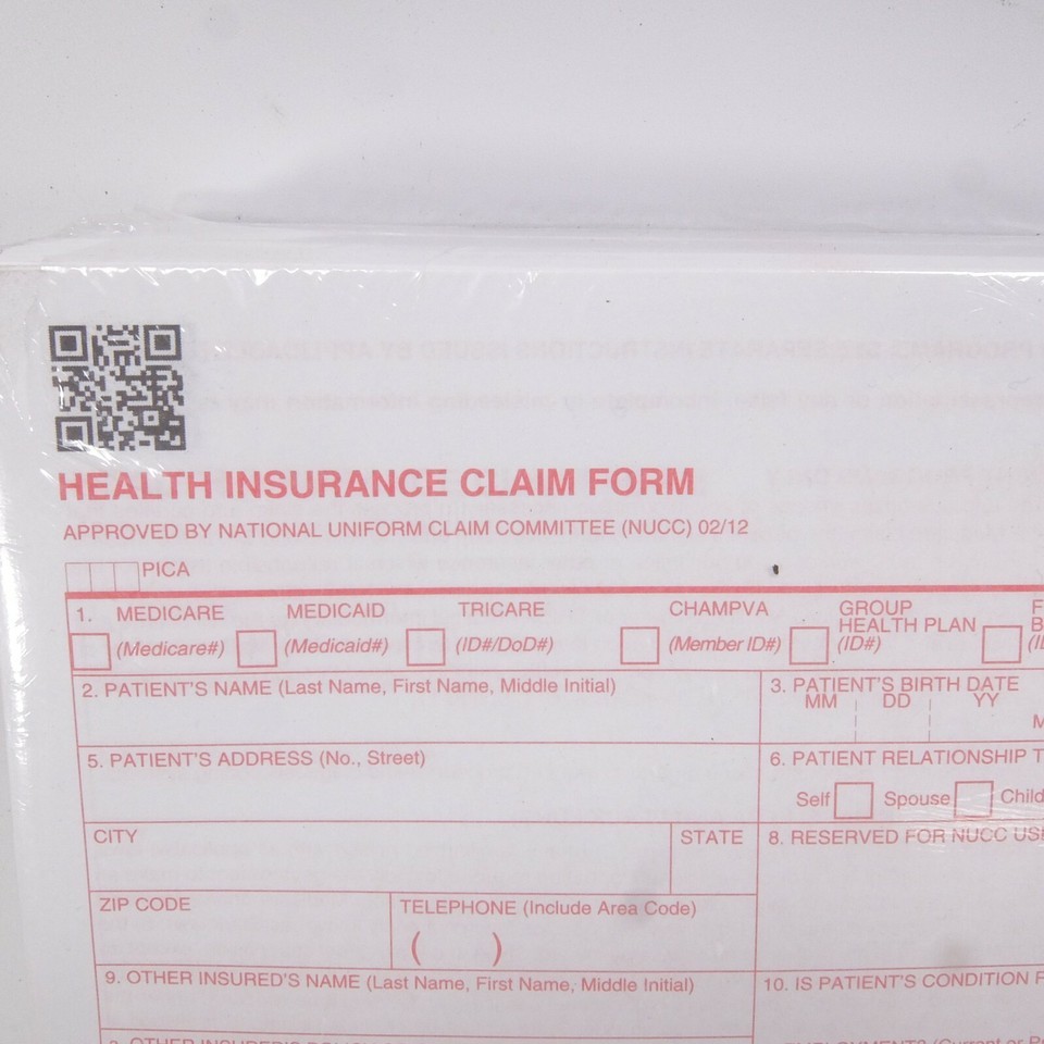This is a pack of 500 sets of 8 1/2" x 11" health insurance claim forms. They are printed with red ink on white background. They are NUCC/OMB approved.