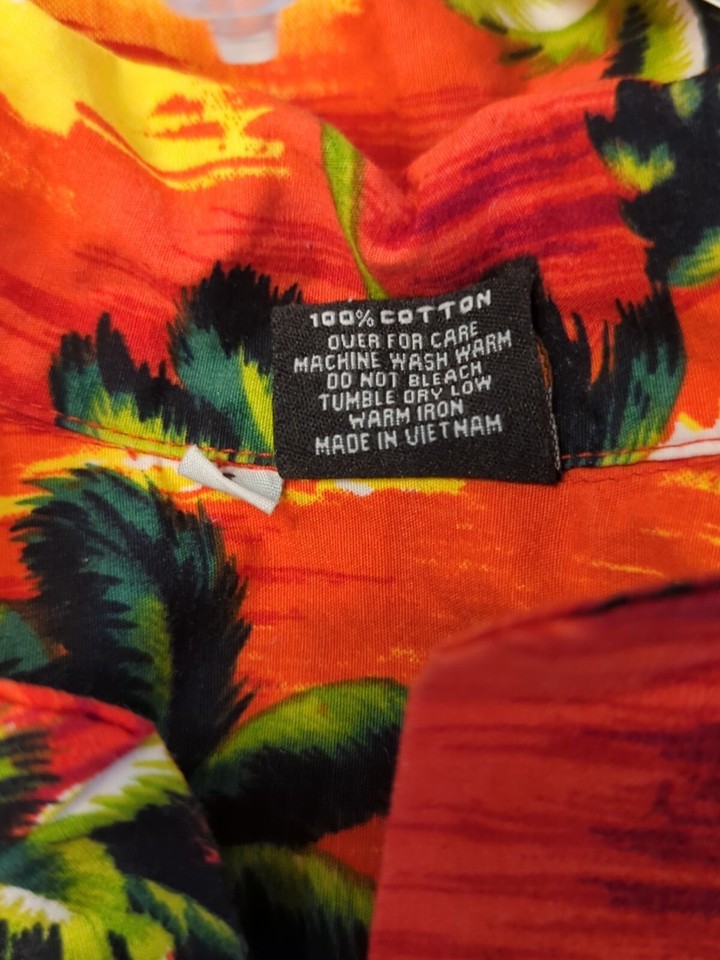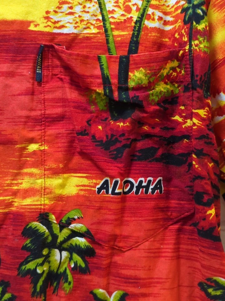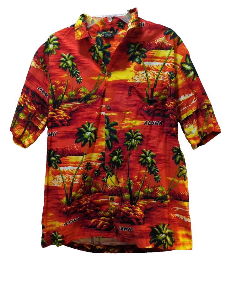 Aloha Fashion Men's shirt L large red yellow Hawaiian palm trees sunset waves