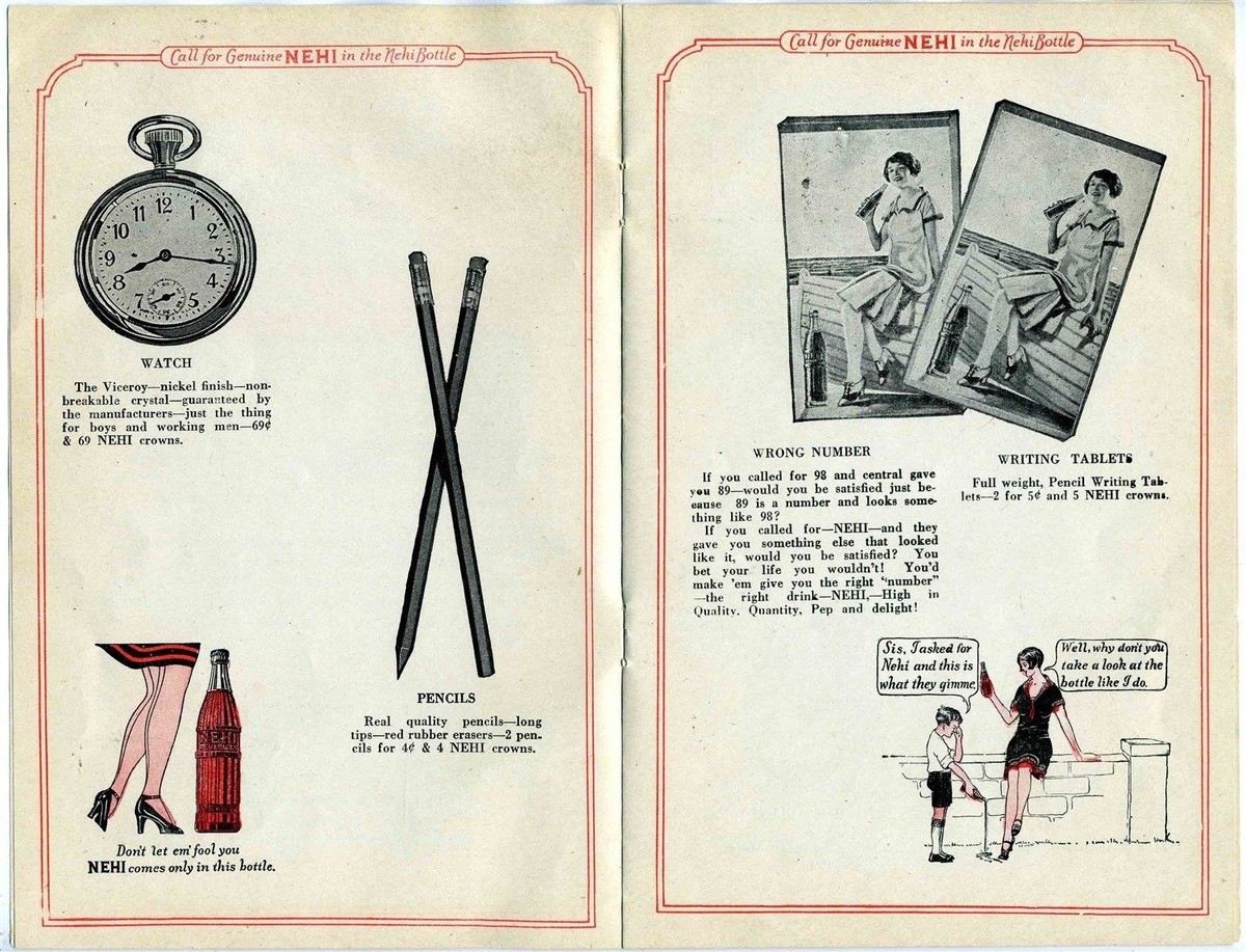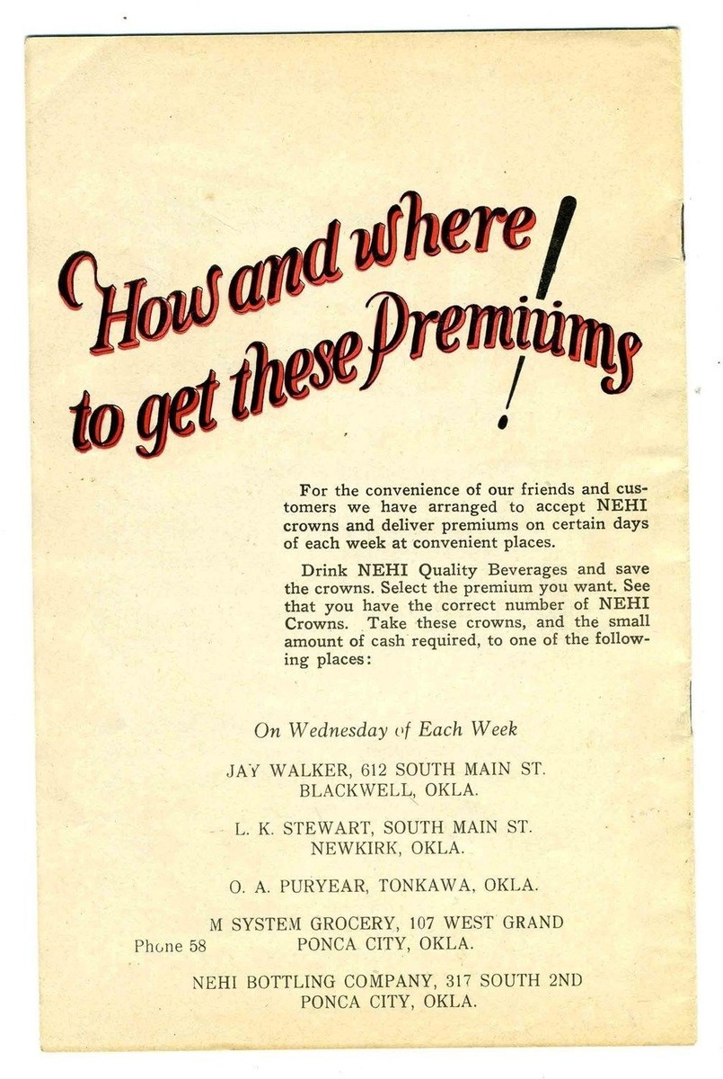 A 12 page soft cover booklet of products that could be acquired by saving the Crowns of NEHI Beverages. 12 paged soft cover in fine condition. Drink Genuine NEHI Quality Beverages. Circa 1920's with redemption centers listed on the back cover. All were in Oklahoma.