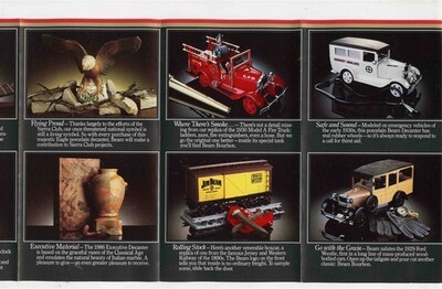 An 12 panel full color fold out brochure from 1982. Jim Beam Decanter Brochure with images and information on Railroad Decanters, Flying Proud, First Lady , Executive Material , The Great Outdoors, No Present Like Time, Musicmaker, Where There's Smoke and more.