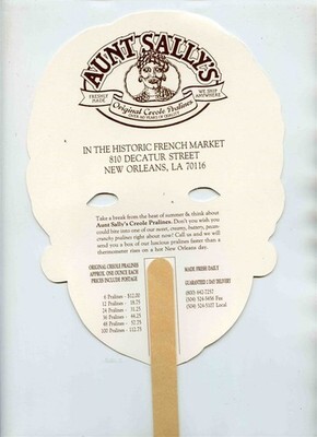 A paper Aunt Sally's Original Creole Pralines Mask on wooden Stick. Located in the French Market in New Orleans Louisiana. Measures about 7" x 12 1/2".