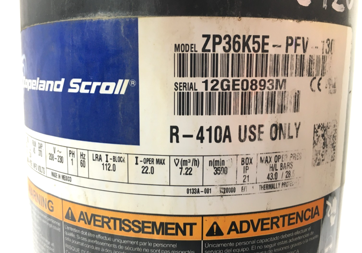 This is COPELAND Scroll ZP36K5E-PFV-130 36,000 BTU 230V 1PH 60HZ R-410A only! used part.