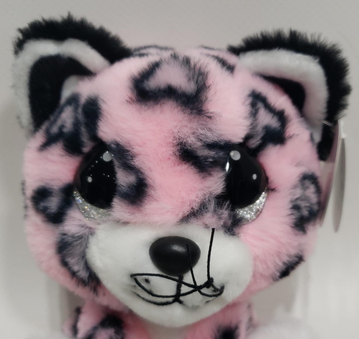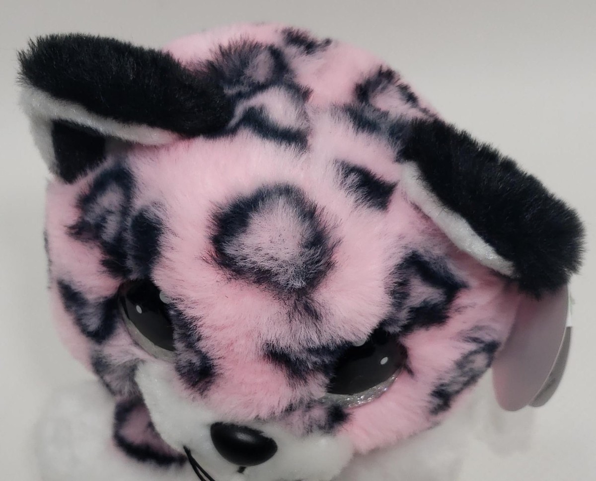 The plush features a vibrant pink and black leopard pattern with a white face, belly, and paws.
