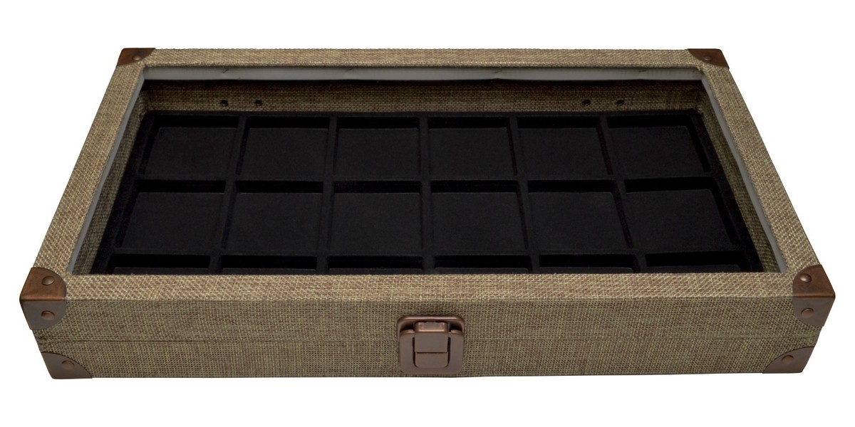 Burlap Dark Beige Metal Clasp 18 Display Pocket Watch Show Case