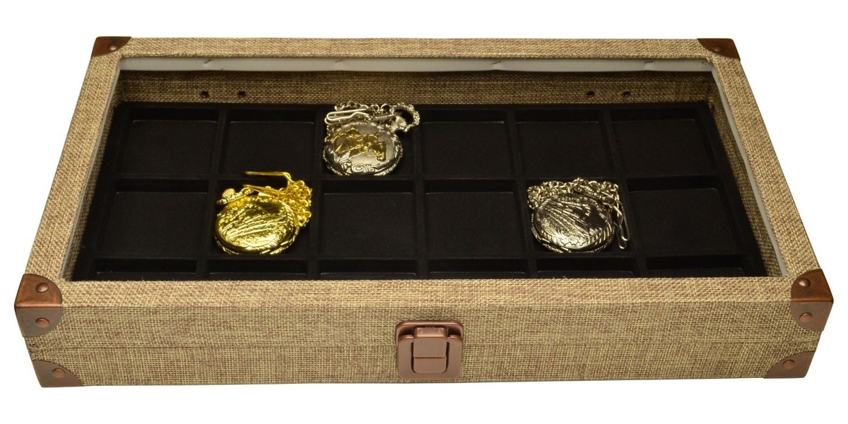 18 Display Pocket Watch Show Case Burlap Dark Beige Metal Clasp