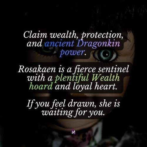 Rosakaen is capable of granting immense wealth and opportunities. The blood of Dragon's has been sought after by humans for centuries. It is pure power in a concentrated form. Rosakaen will present herself to you first in the astral/dream plane. You will see her in the physical plane once you build a bond with her.