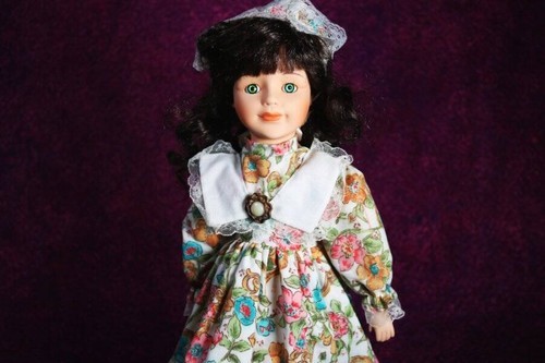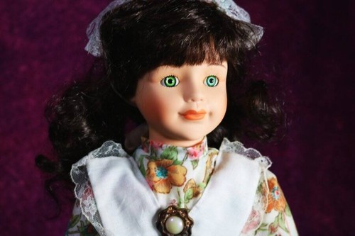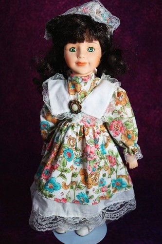 You will be receiving a beautiful porcelain doll. Rosakaen is around 14-16 inches tall. Her body is stuffed with her head, neck, arms, and legs are made of porcelain. She has wavy, black hair topped with a bow. She has striking green eyes. She is wearing a white, flower-patterned dress with frills.