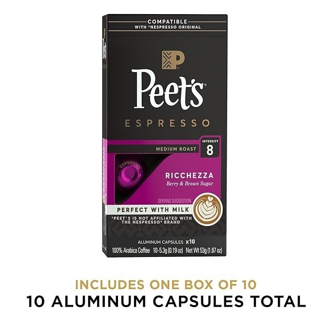 Peet's Coffee, Medium Roast Espresso Capsules, Compatible with Nespresso Original Machine - Ricchezza Intensity 8, 10 Count (1 Box of 10 Espresso Capsules)