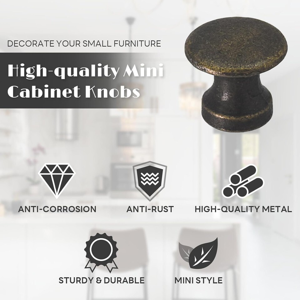 ?Compact Size-25PCS cabinet knobs are designed in mini size, the diameter of the top 0.45inch, the height 0.4inch, and the diameter of the bottom 0.3inch. The included screws are 0.45 inches long. The mini knobs and screws are perfectly sized to ensure a secure and stable connection. The knobs are both functional and aesthetically pleasing.