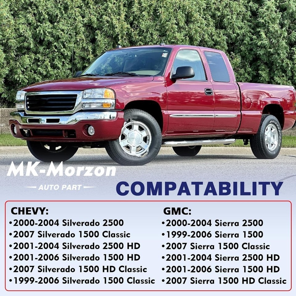 ?Compatibility?Fit for Chevy Vehicles:2001-2004 Silverado 2500 HD; 2000-2004 Silverado 2500; 2007 Silverado 1500 HD Classic; 2001-2006 Silverado 1500 HD; 2007 Silverado 1500 Classic; 1999-2006 Silverado 1500 Classic.Fit for GMC Vehicles:2001-2004 Sierra 2500 HD; 2000-2004 Sierra 2500; 2007 Sierra 1500 HD Classic; 2001-2006 Sierra 1500 HD; 2007 Sierra 1500 Classic; 1999-2006 Sierra 1500.