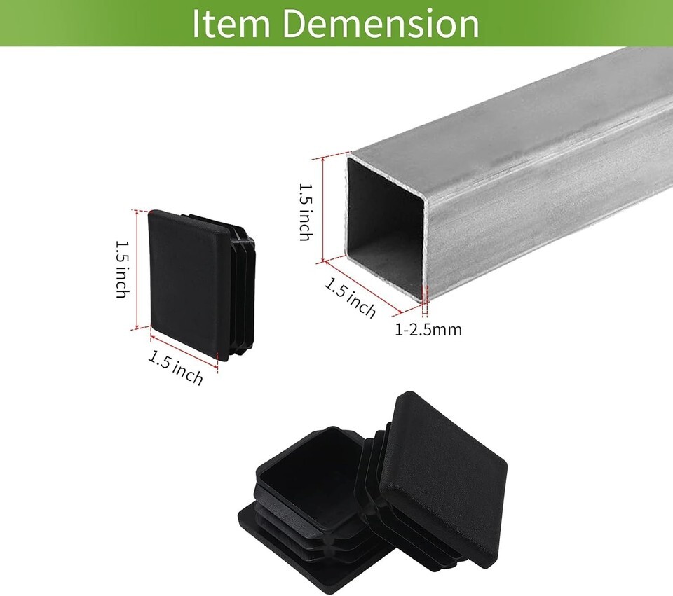 ??Item Dimension? - You will get 12pcs 1 1/2 1.5" square plastic plugs, the end cap fits 1 1/2" (1.5 inch) OD square tubing (1.5x1.5) and wall thickness of 0.039" - 0.118". NOTE: When you buy before, please check size of the plastic plug is suitable for your tubing.