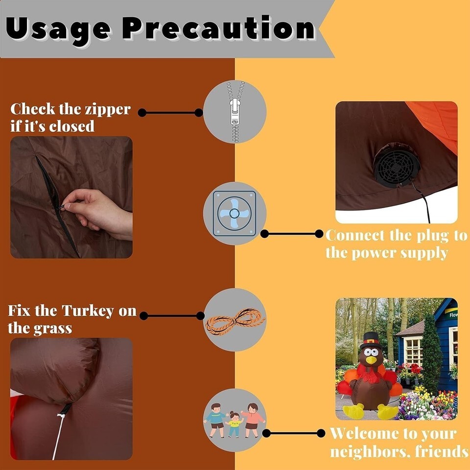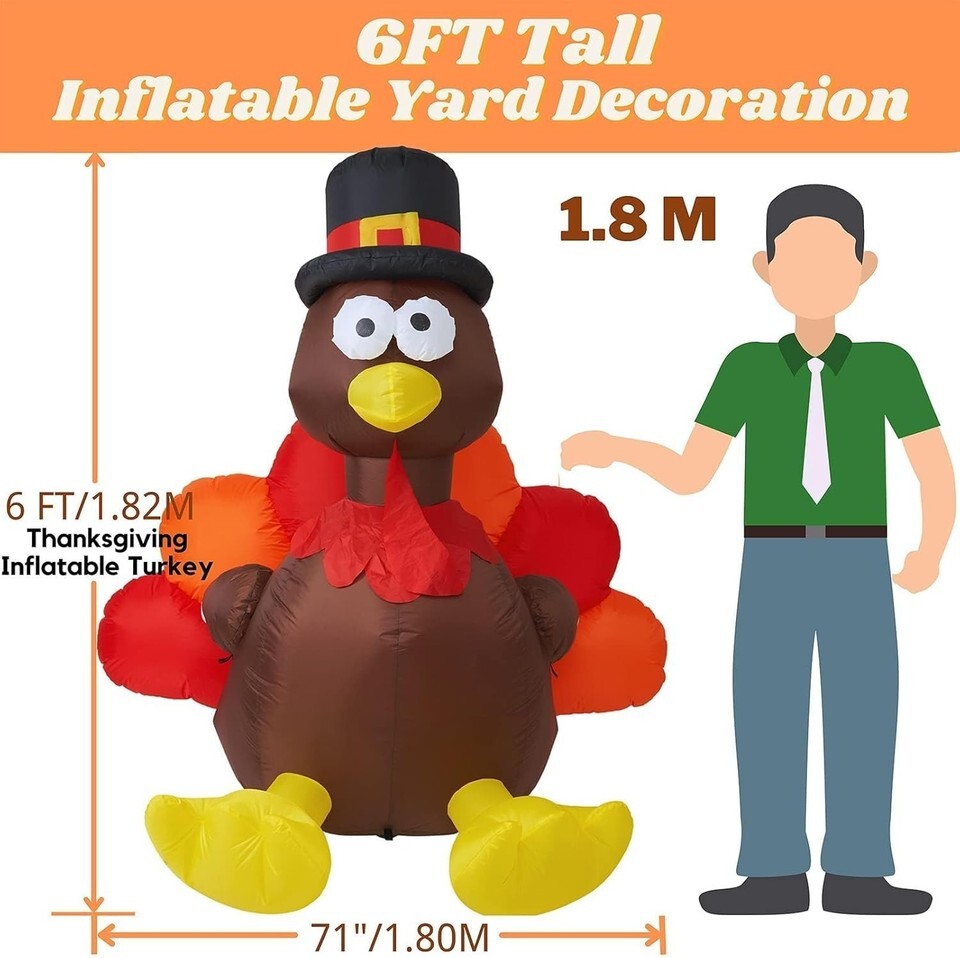 ???Blow Up Turkey Inflatable?6ft high Thanksgiving Inflatable Turkey with pilgrim hat, holiday blow up yard decorations. Just plug this cute dark brown inflatable turkey in, only a minute it will be standing up to its full height, unique and adorable design, create a Thanksgiving festive atmosphere, ready to delight all your neighbors and guests in this Autumn.