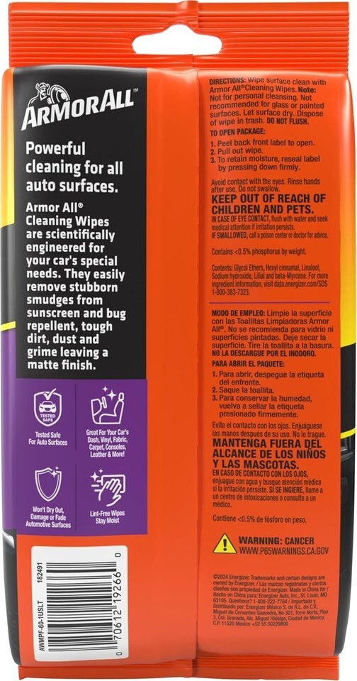 Lift away dirt in a single wipe with Armor All Multi Purpose Car Cleaning Wipes. Great for the whole car, these all-in-one automotive wipes easily remove grime to reveal natural "just detailed" look. These convenient, disposable Armor All wipes are meticulously engineered for your car's special needs. Just wipe the dash, vinyl, fabric, carpet, consoles and more'this formula won't dry out, damage, or fade surfaces. The lint free wipes leave behind an exceptional clean and a matte finish that brings out your car's natural beauty. A Moisture Lock Lid keeps these automotive wipes fresh for a year.