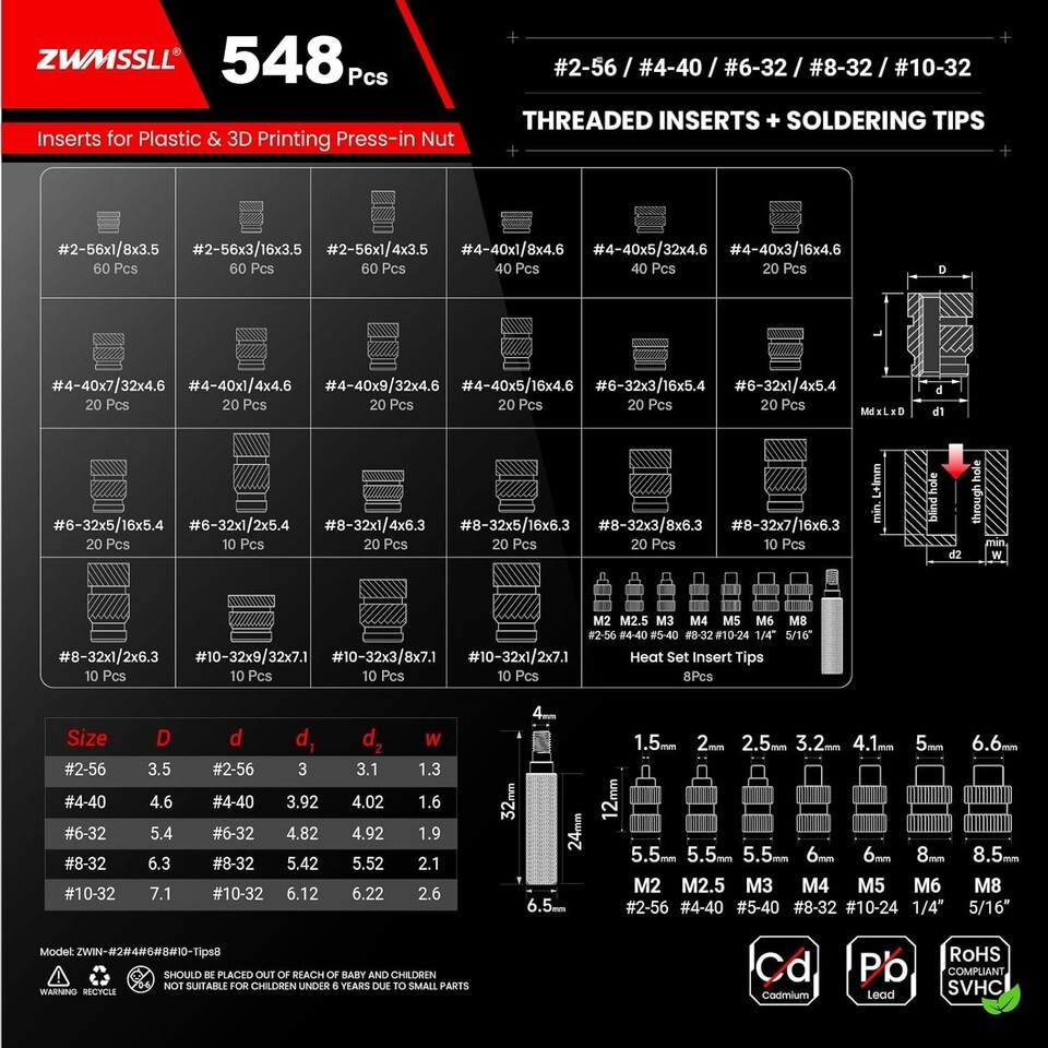 ?Practical Threaded Insert Box?- 548 pieces total 22 sizes with 8xSoldering Tips for Heat-Set Insert, containing 2#-56x1/8(60Pcs) 2#-56x3/16(60Pcs) 2#-56x1/4(60Pcs) 4#-40x1/8(40Pcs) 4#-40x5/32(40Pcs) 4#-40x3/16(20Pcs) 4#-40x7/32(20Pcs) 4#-40x1/4(20Pcs) 4#-40x9/32(20Pcs) 4#-40x5/16(20Pcs) 6#-32x3/16(20Pcs) 6#-32x1/4(20Pcs) 6#-32x5/16(20Pcs) 6#-32x1/2(10Pcs) 8#-32x1/4(20Pcs) 8#-32x5/16(20Pcs) 8#-32x3/8(20Pcs) 8#-32x7/16(10Pcs) 8#-32x1/2(10Pcs) 10#-32x9/32(10Pcs) 10#-32x3/8(10Pcs) 10#-32x1/2(10Pcs)