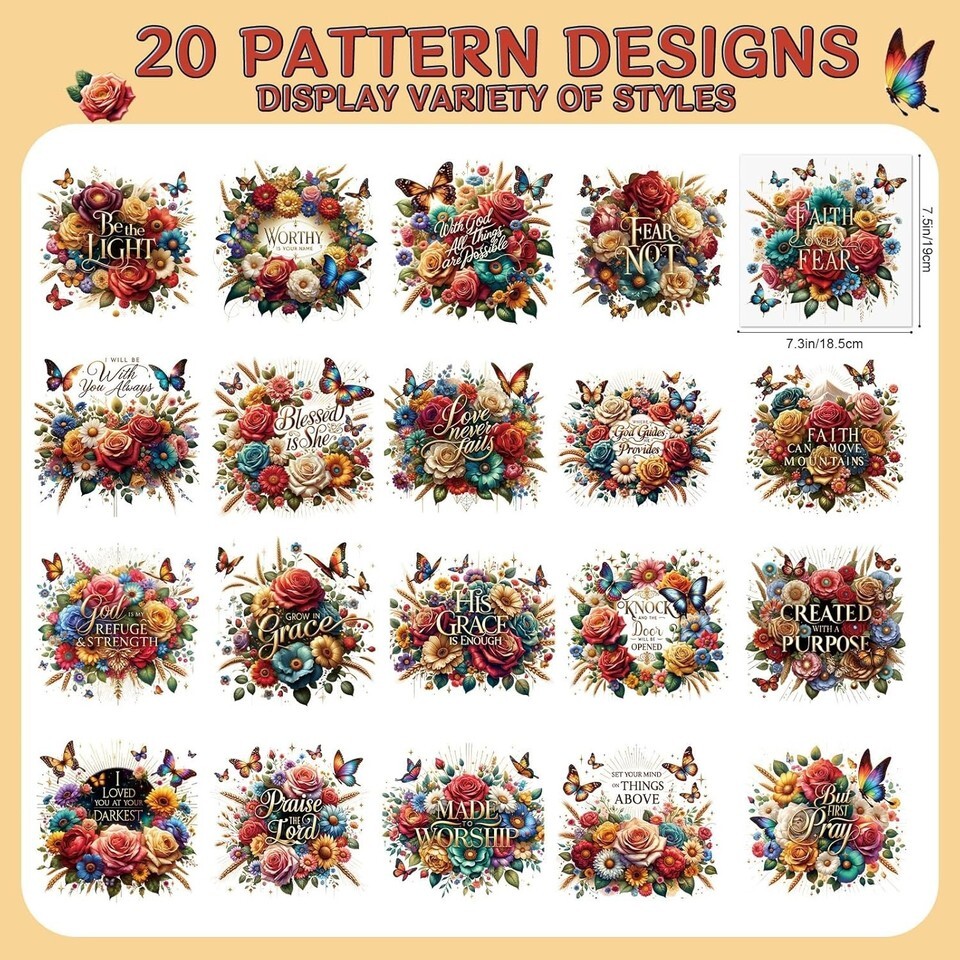 Various Designs: This set includes 20pcs different flower bible verse iron on transfers for tshirts;measuring approximately 18.5x25cm/7.2x9.8inches; perfect for adding a personal touch to t-shirts, bags, pillow, hoodies, jeans and more