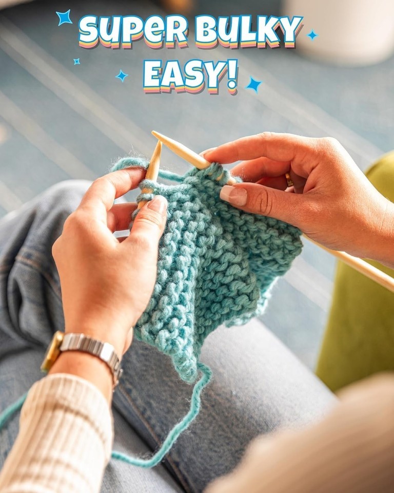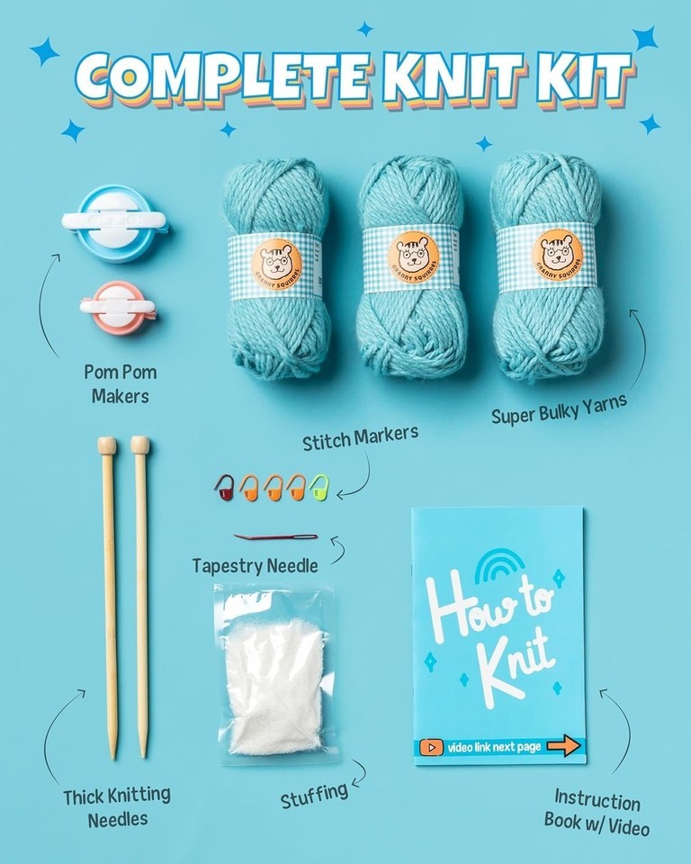 The Kit Contains Everything You Need: Nothing is left out of our how to knit for beginners kit; Included in this knitting starter kit are 3 super bulky yarn skeins, bamboo knitting needles for beginners, knitting stitch markers, pom-pom makers, and much more