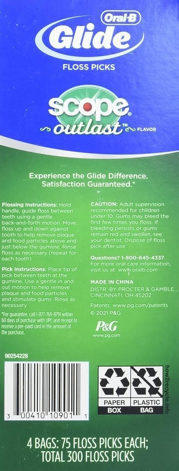 Oral-B Advantage Floss Picks Plus Scope Outlast Flavor are easy to use and provide a more complete clean. Picks feature a dual-action TextureSlide floss, and an easy-use comfort grip handle. The TextureSlide Floss has a soft bristle-like texture that effectively removes plaque and food particles and is designed with a soft, velvety material to slide comfortably in between your teeth.