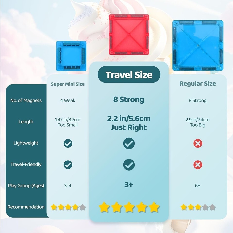 ?On The Go Magnetic Tiles?Crenova magnetic building block toy playset MINI series is compact enough for a tote, backpack, or carry-on bag. This magnet construction toy offers hours of entertainment to your kids, whether they are playing in the classroom, enjoying a meal out, sitting on a plane, car or train during the tour. It is a great travel essential for toddlers? trip! *Please note that mini size tiles is 5.6cm/2.2inch, which is NOT interchangeable with the standard/regular size tiles (7.4cm/2.9in).