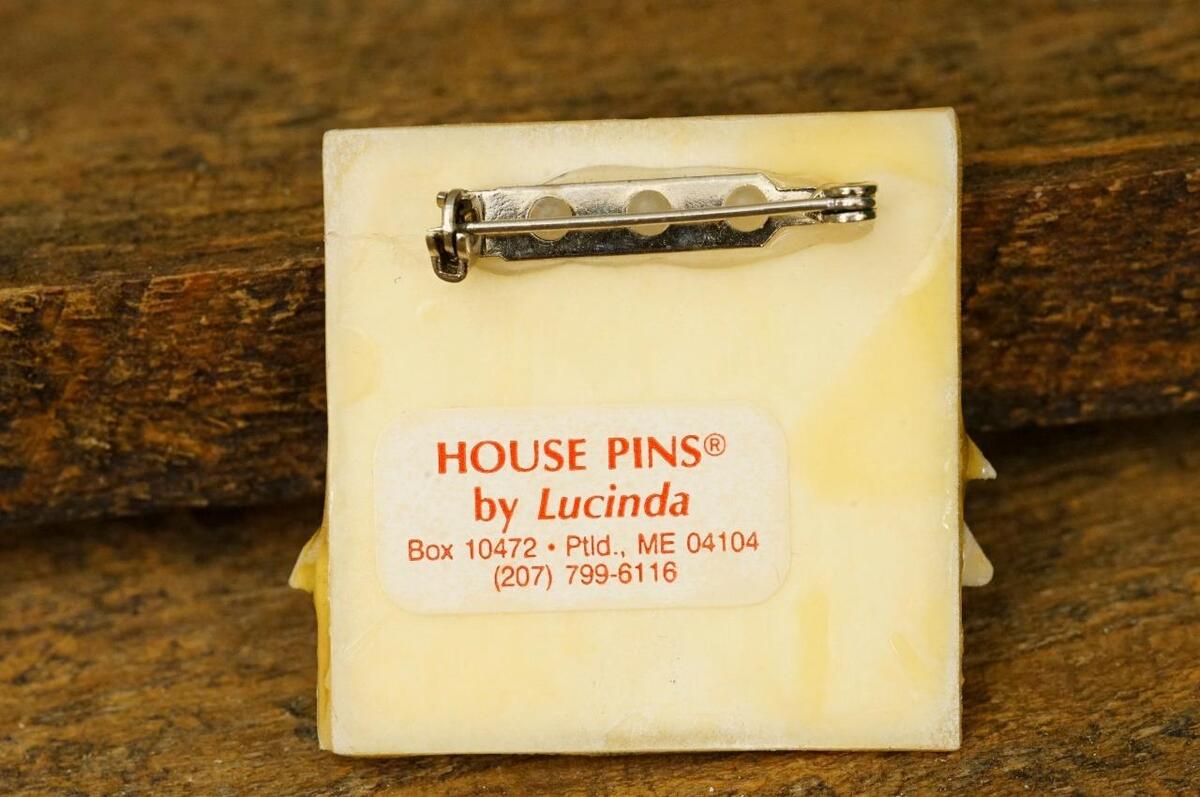 Artisan Crafted Fused Plastic Brooch Multi Color House Cloud Pin Lucinda Yates. The pin measures 1.75" wide by 1.5" tall. Signed on the back. Glossy. No smoke or pet odor.