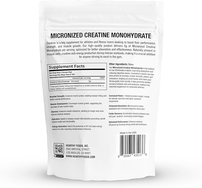 Power Up Your Performance with Hearthy Foods Micronized Creatine Powder 500g! Elevate your fitness journey with Hearthy Foods Organic Creatine Powder, the ultimate choice for athletes and fitness enthusiasts who demand superior quality. Packed with 5 grams of creatine bulk supplements per serving, this creatine nutritional supplements are designed to fuel your muscles, enhance endurance, and accelerate recovery. Each 16oz creatine women bag provides an impressive 100 servings, giving you a long-lasting, cost-effective solution to power through your workouts and smash your fitness goals with our creatine supplement. Hearthy Foods uses advanced micronization creatinine to create a finely milled powder that mixes seamlessly into any beverage without clumps or grit. Enjoy a smooth, unflavored experience with our muscle feast creatine that pairs perfectly with water, juice, or your favorite post-workout shake. Crafted to support a wide range of dietary needs, this protein powder with creatine is vegan-friendly, gluten-free, and non-GMO, making it an excellent choice for anyone committed to a clean and healthy lifestyle with this creatine hcl powder. Whether you?re lifting weights, sprinting, or tackling high-intensity training, Hearthy Foods Micronized Kreatin is your trusted partner in building strength, boosting endurance, and achieving peak performance. Push past your limits, break through plateaus, and recover faster with every scoop. Experience the difference of quality with bulk creatine you can trust?fuel your fitness journey with Hearthy Foods Creatine Micronized today!