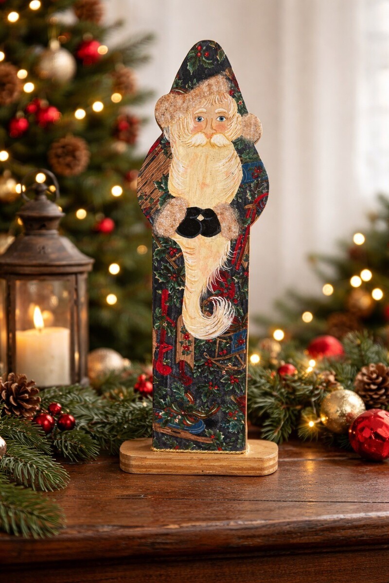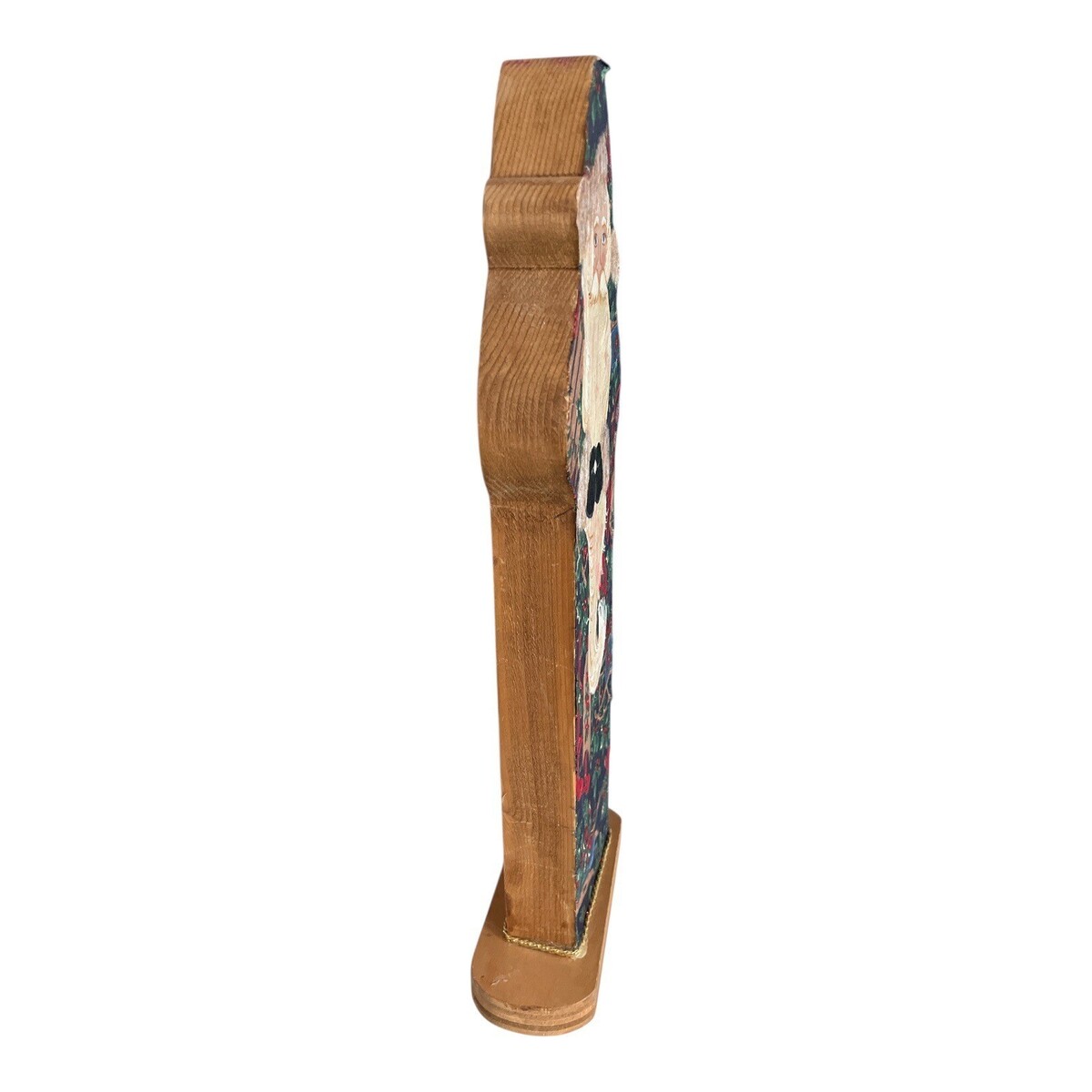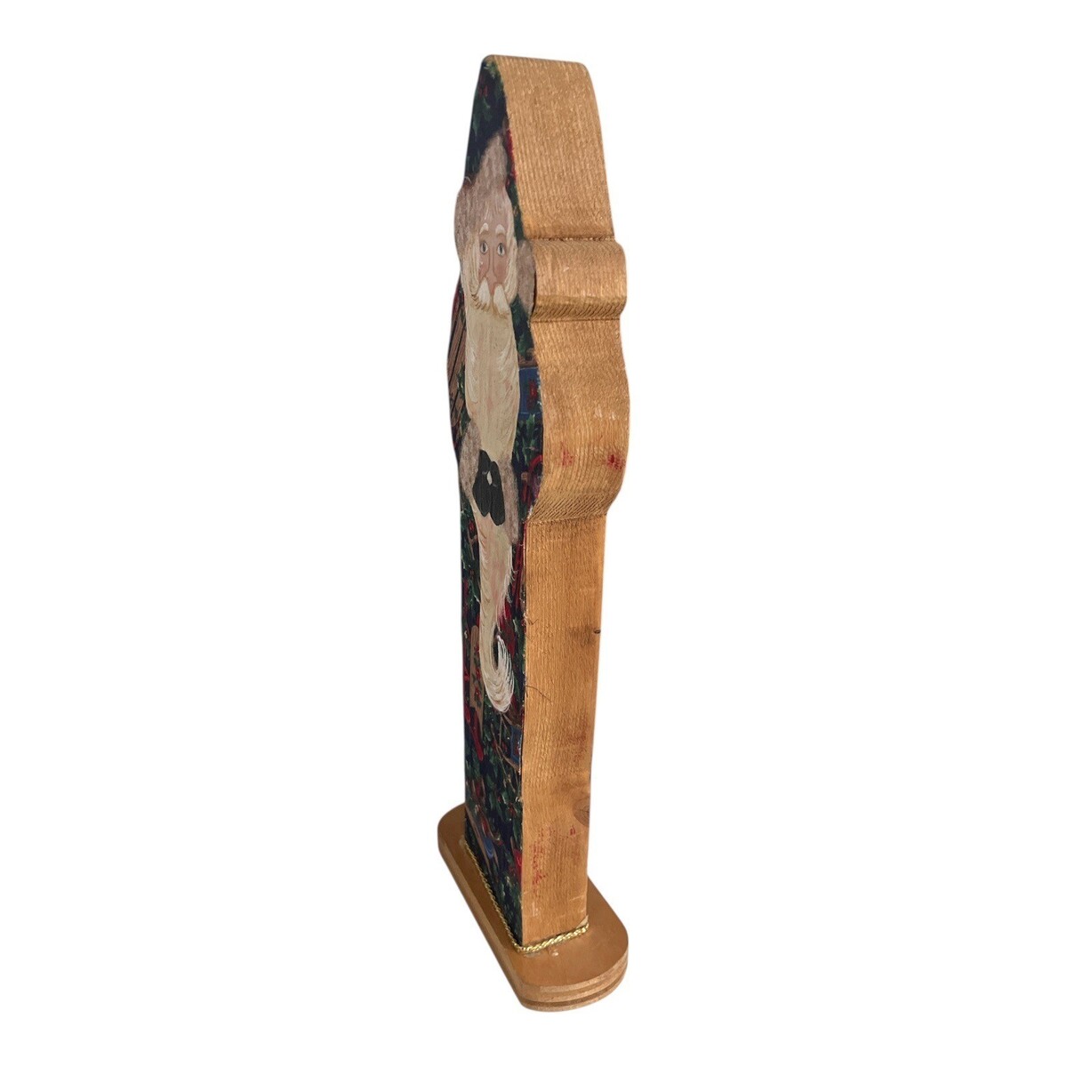 Vintage wooden Santa figure featuring a printed cloth image mounted to a solid wood backing. The Santa design displays a traditional folk-style holiday scene with holly, ribbon, and rustic Christmas elements. This freestanding decorative piece has a carved wood silhouette and stands securely on a rectangular base. A charming seasonal accent for mantels, shelves, or tabletop displays, especially suited to rustic, farmhouse, or traditional Christmas decor.