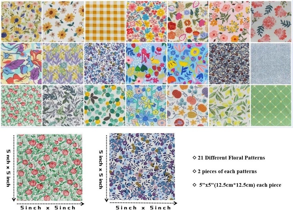 100% Cotton 5"x5" Precut Quilting Squares - Floral Print Fabric Charm Pack Bundle for Patchwork, DIY Sewing Craft Projects (Fresh Style, 42-Piece Set)