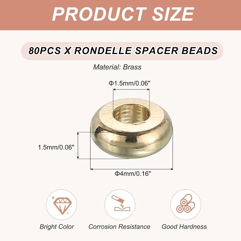 Material: Brass; Inner diameter: 1.5mm/0.06 inch; Outer diameter: 4mm/0.16 inch; Height: 1.5mm/0.06 inch; Color: Gold Tone; In the package of: 80 Pcs x rondelle spacer beads.