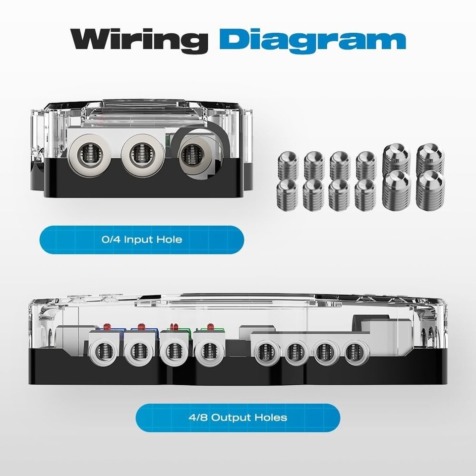 Specifications: The distribution block car audio, made of all copper material, better conductivity ,Its transparent plastic housing protects against dust and corrosion,suitable for 0, 2, 4 gauge cable input and 4, 6, 8 gauge cable output.