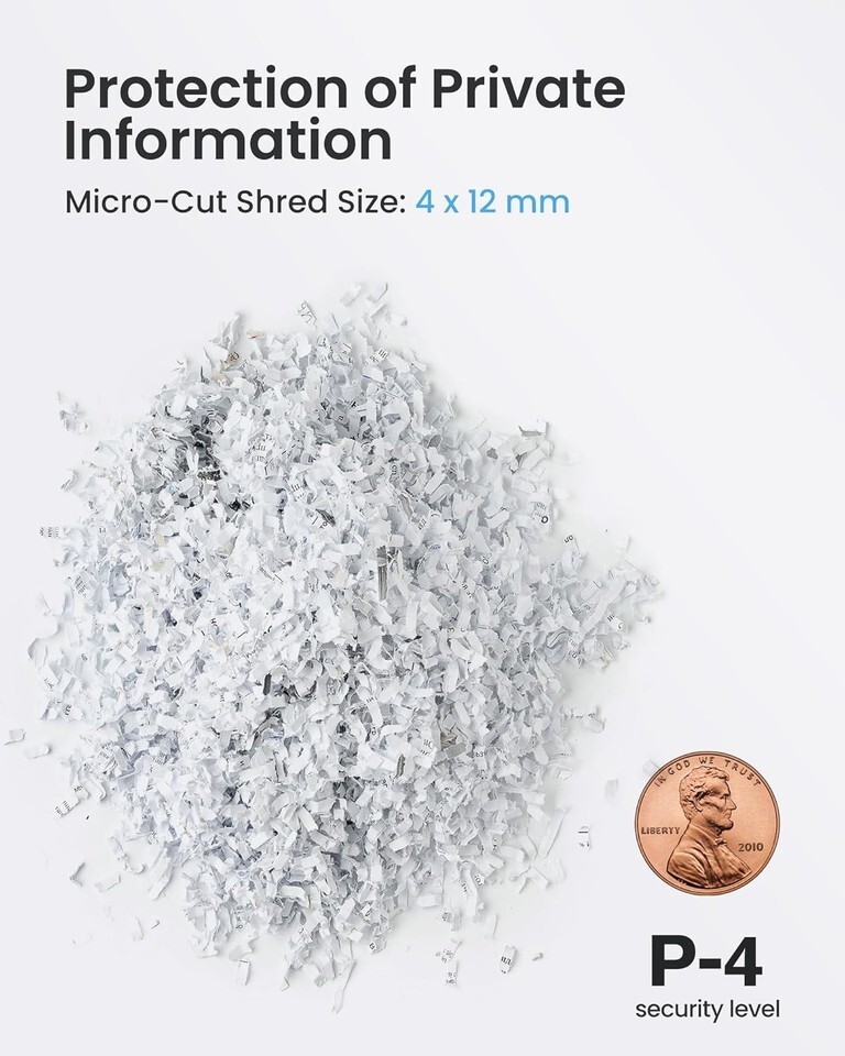 High-Security Shredding: With micro-cut technology, this shredder slices paper into tiny pieces approximately 0.15 x 0.5 inches (4 x 12 mm), meeting P-4 standards for high security. Protects confidential information from identity theft and fraud.